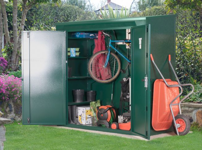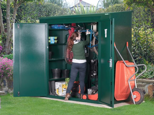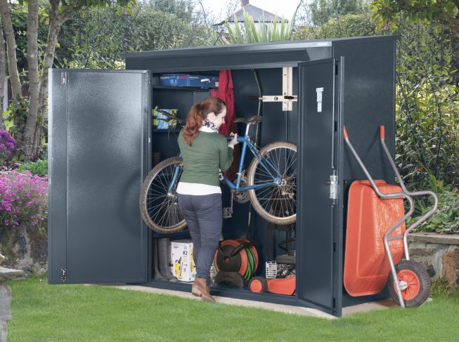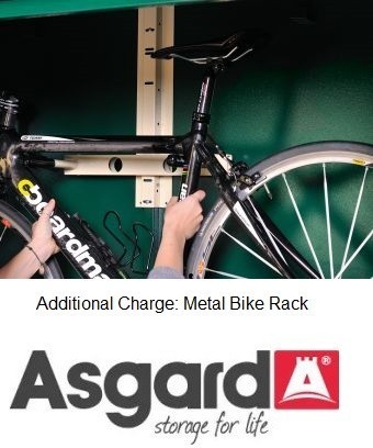 Inside the Asgard 7’x3′ Trojan Heavy Duty Metal Shed features an optional integral bike rack, designed to hold a single bike. The bike rack features bike locking points and security screws, helping to keep your bike safe from theft. This UK designed and manufactured garden store is exceptionally versatile and ideally suited for areas where floor space is at a premium or when you need extra height.