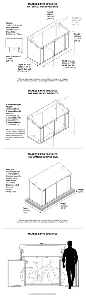 The Asgard 8’x4′ Maxess E Pro Heavy Duty Metal Shed – Extra High is a heavy-duty bike shed designed for storing the next generation of electric bikes, this extra high, multipurpose “walk-in” storage unit is ideally suited for the larger/ oversized “sit up and beg” style e-bikes.