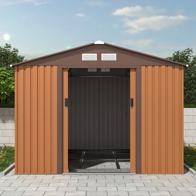 It’s designed with two sliding doors, four air vents and an apex roof. A must-have item for any outdoor living space, this practical metal garden shed will last for years to come. Features two sliding doors (on 8ft side), four vents, lockable door (holes on handles for a padlock, please note padlock is not supplied), zinc steel frame base is included, rust, fire and rodent proof, and weatherproof.