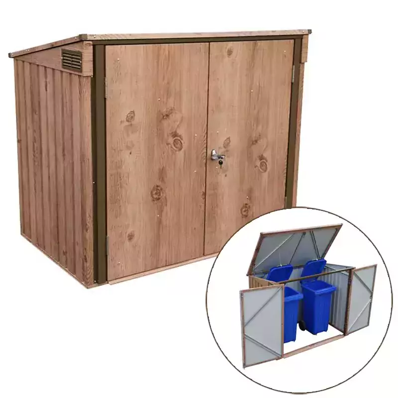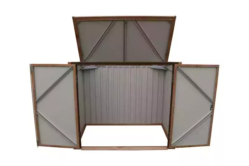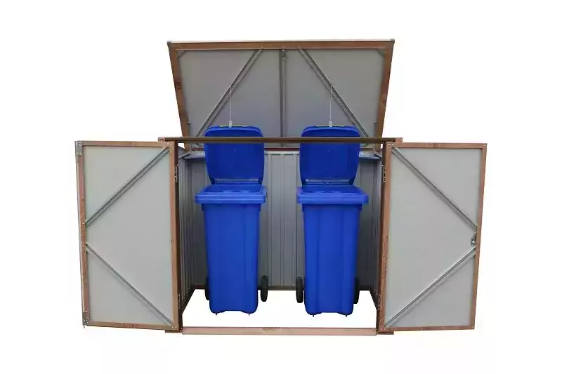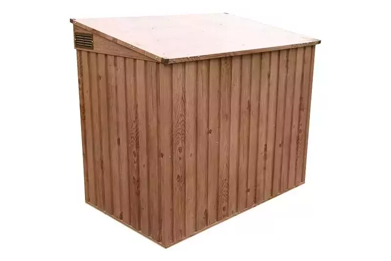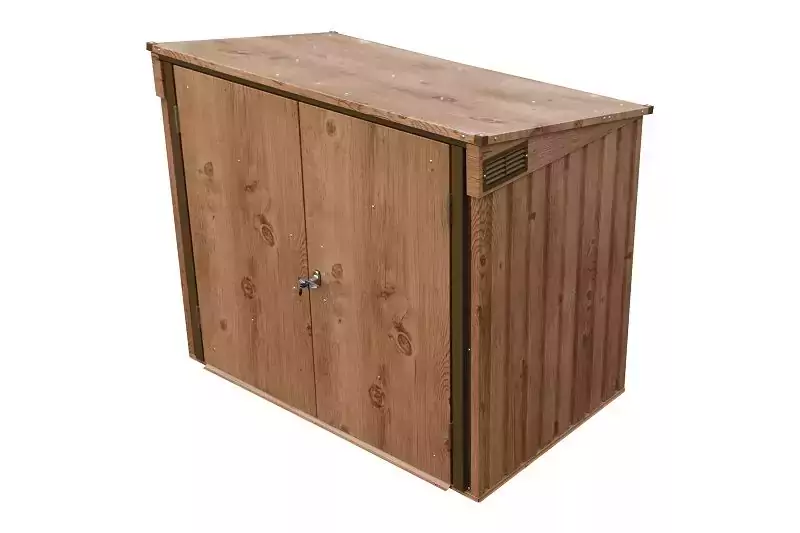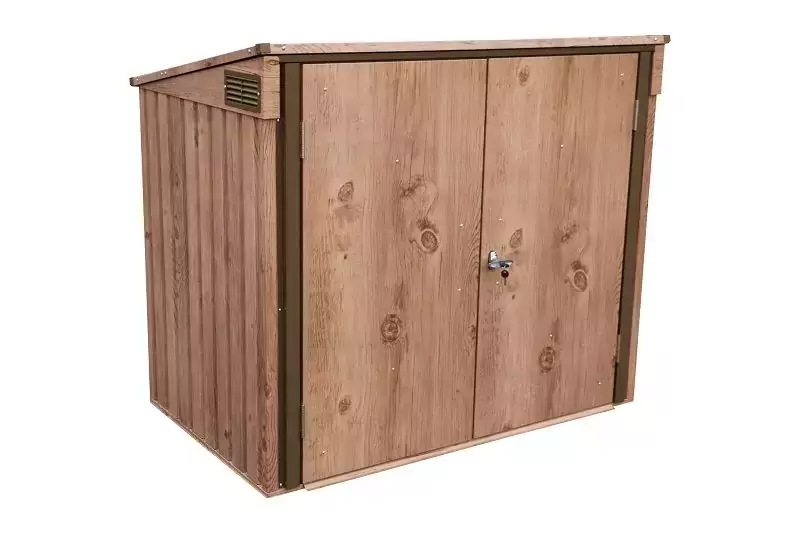 The Duramax Metal Double Wheelie Bin Store – Woodgrain Brown has enough room to store 2 x 240L wheelie bins inside.