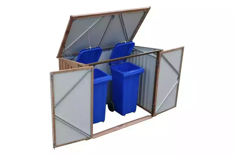 There are two openings to the bin store, there is a large double opening door to the front with a ramped door bar for easy access and a large lid which is gas strut supported so that you can access the bin lids easily when putting the rubbish out. This storage unit can be used for a variety of other purposes as well as bin storage such as for storing garden tools and equipment.