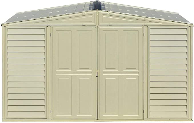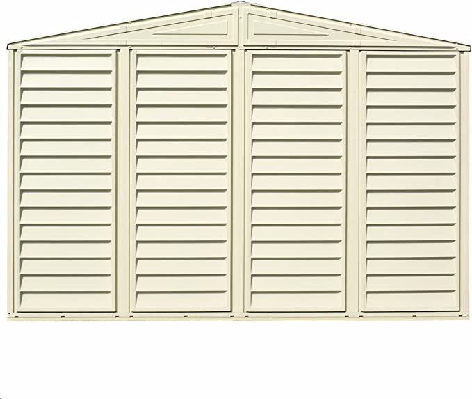 The Duramax SidePro Vinyl 10.5’x3′ Apex Shed is maintenance-free. and is constructed of durable all-weather vinyl in neutral ivory, it will never need painting or treating. It will not rust, dent, rot, mildew or fade. It is also fire retardant and much quieter in the rain than metal sheds. The wall columns are reinforced with a solid metal structure, giving the shed a lot of strength and making it easy to hang shelves or garden tools.