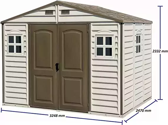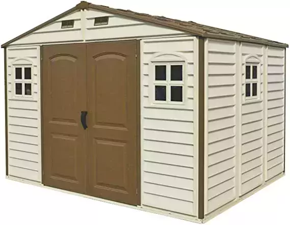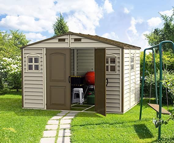 The Duramax Woodside Apex 10’ x 8’ Vinyl Garden Storage Shed – Brown shed features wall columns that are reinforced with solid metal allowing you to easily hang shelves.