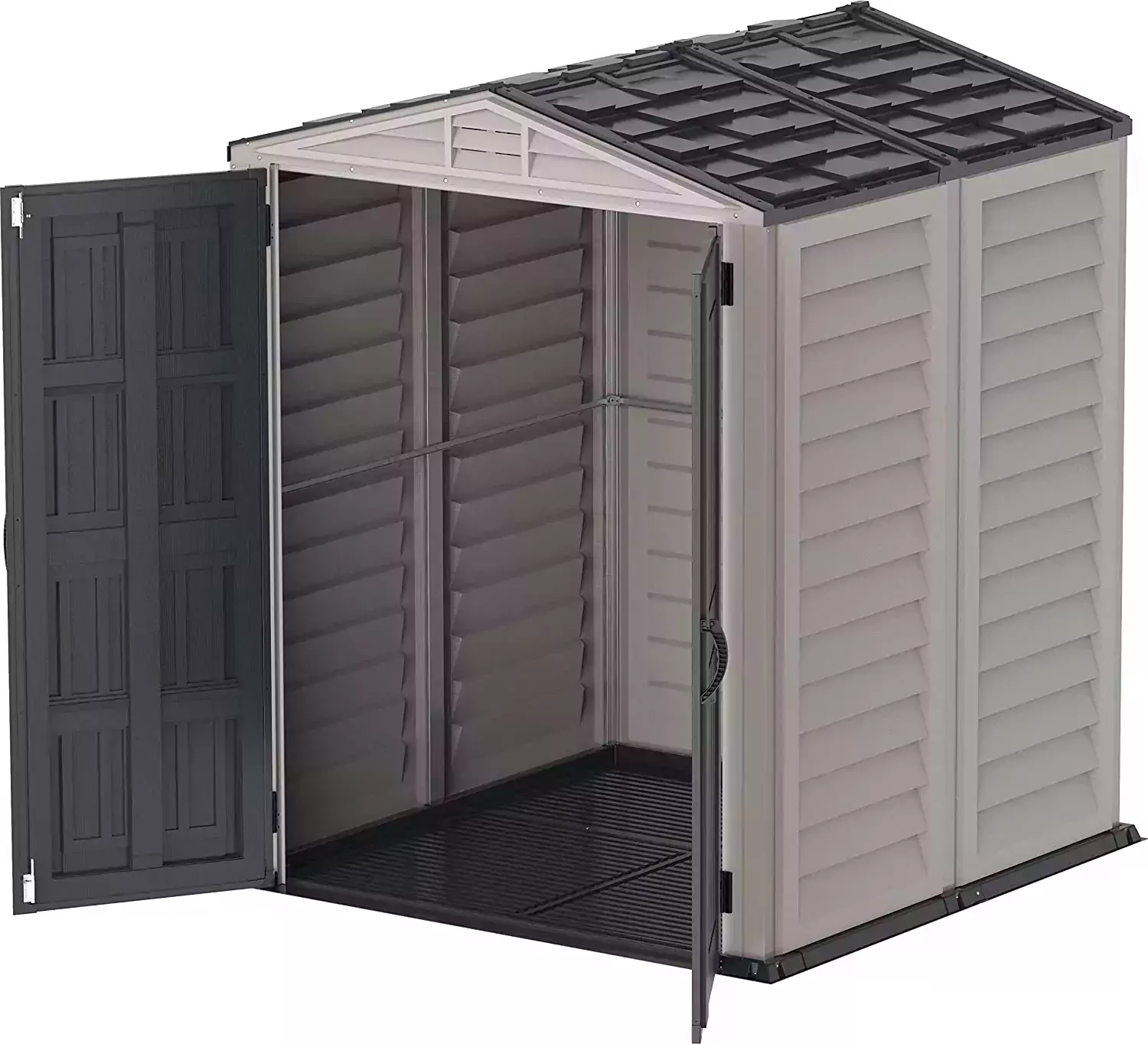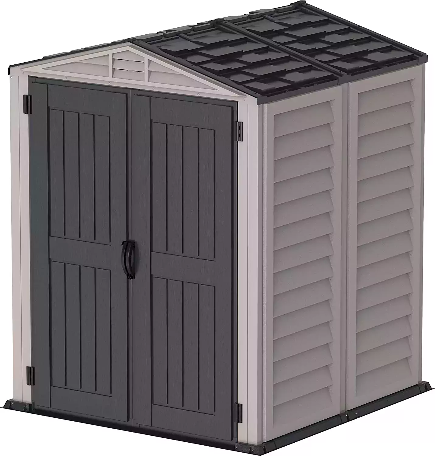 The new and improved YardMate Apex 5×5 vinyl shed kit from DuraMax is back and is built tough with all weather durable vinyl resin and a reinforced strong steel structure!