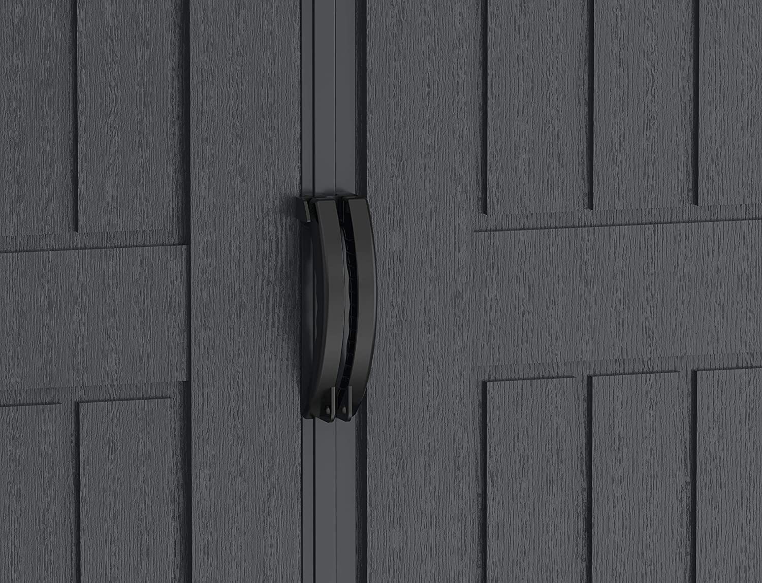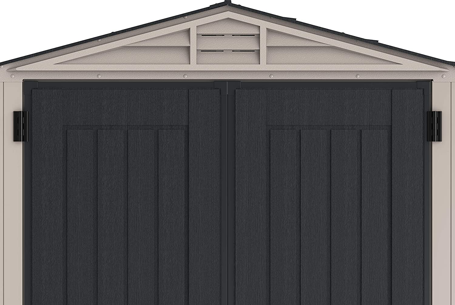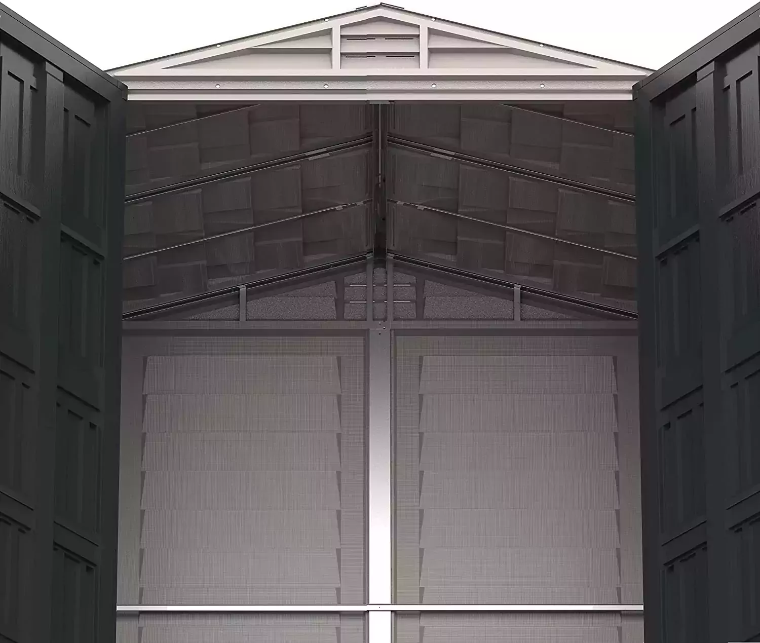 Walk into a comfortable interior height of just over 6 ft of clearance. It’s spacious design offers enough room for storing most garden tools and wide double doors allow for easy entry and exit of larger items needing storage.