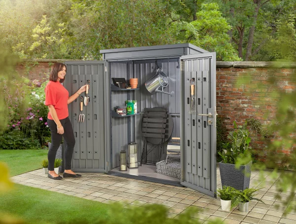 Whilst more compact than Hixon, the Weston features two outward opening doors that can be folded back to either 90 or 120 degrees allowing for easy access. Both interior door panels also feature a useful integrated organiser system ideal for hanging garden tools or other small objects – even outdoor lights. Internally, the Weston features two height adjustable shelves for convenient storage and two tool hangers to support larger items such as brooms or garden hoses.