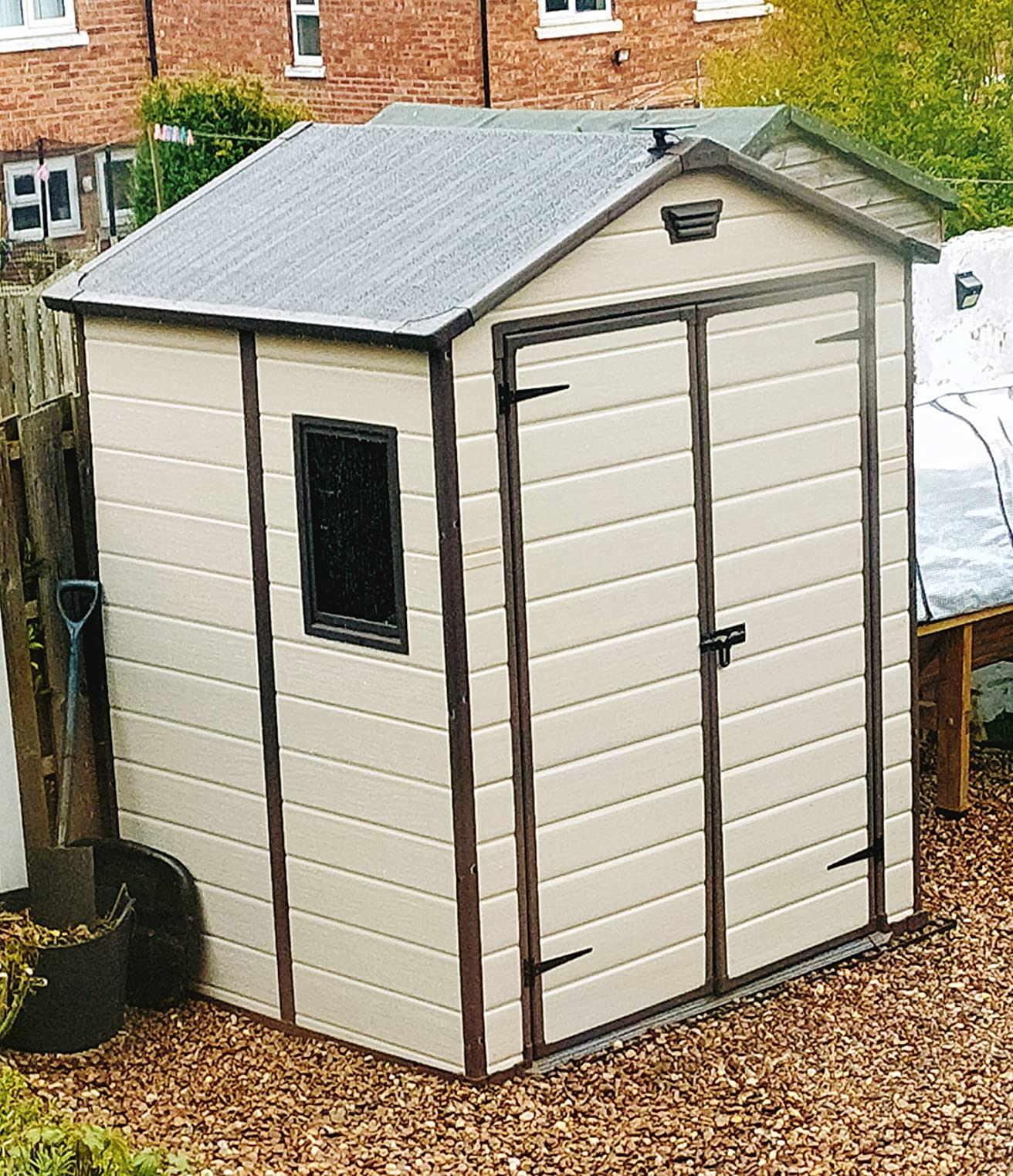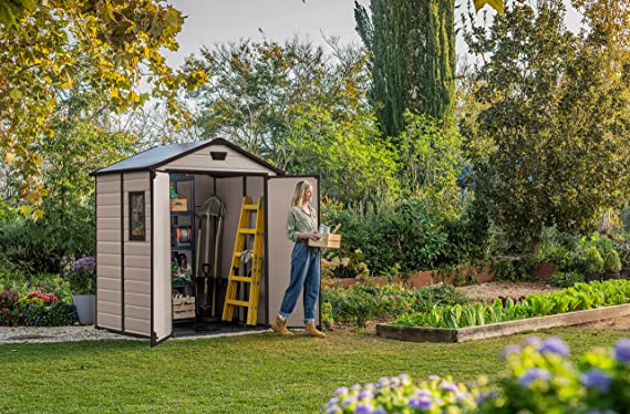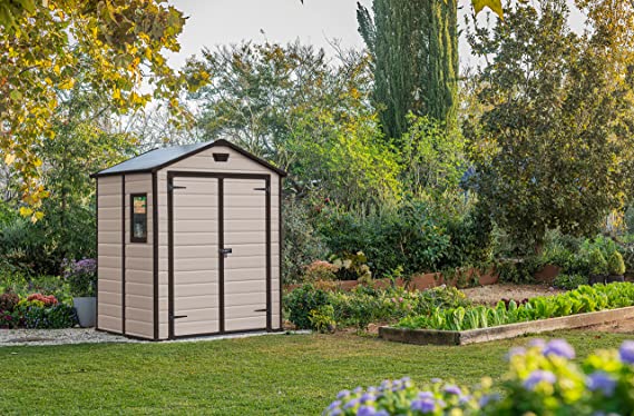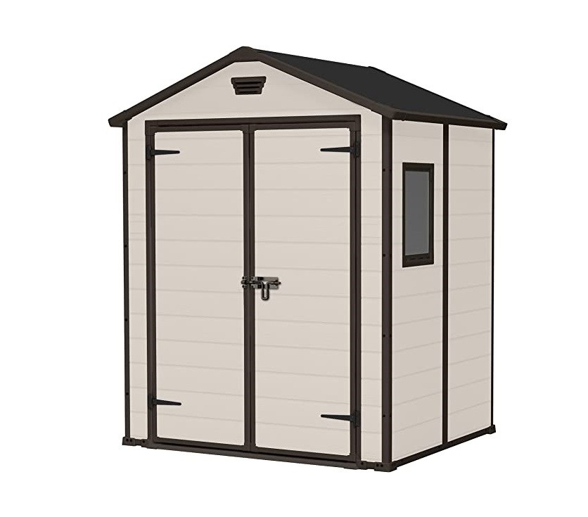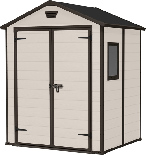 The Keter 6′ x 5′ Manor Plastic Garden Storage Shed – Beige is compact, sturdy and built to last.