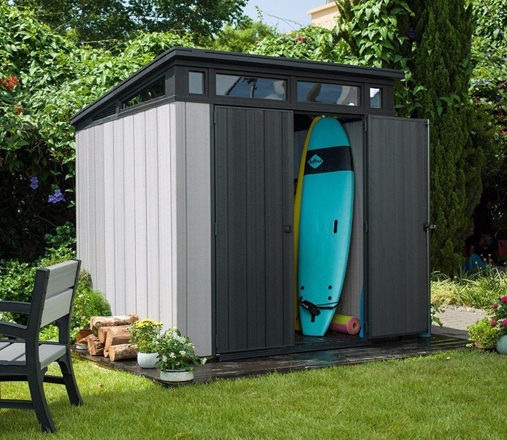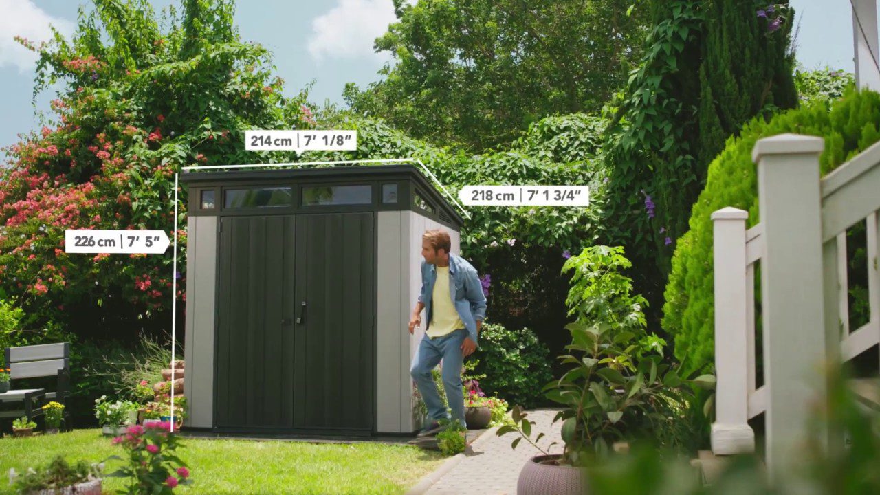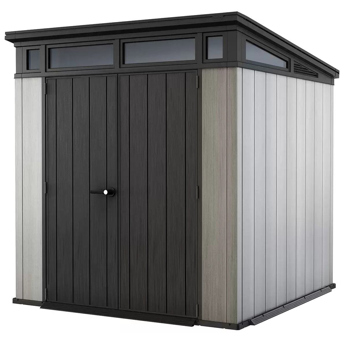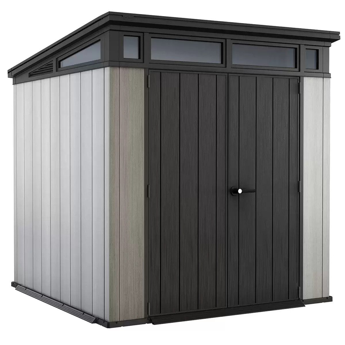The Keter 7’x 7′ Artisan Heavy Duty Plastic Pent Shed  is ideal for storing tall and heavy items due to its high ceilings and integrated heavy-duty resin floor. The Artisan 7 x 7 Shed includes built in high level windows that cover the front and sides of the building to provide natural light into the interior.