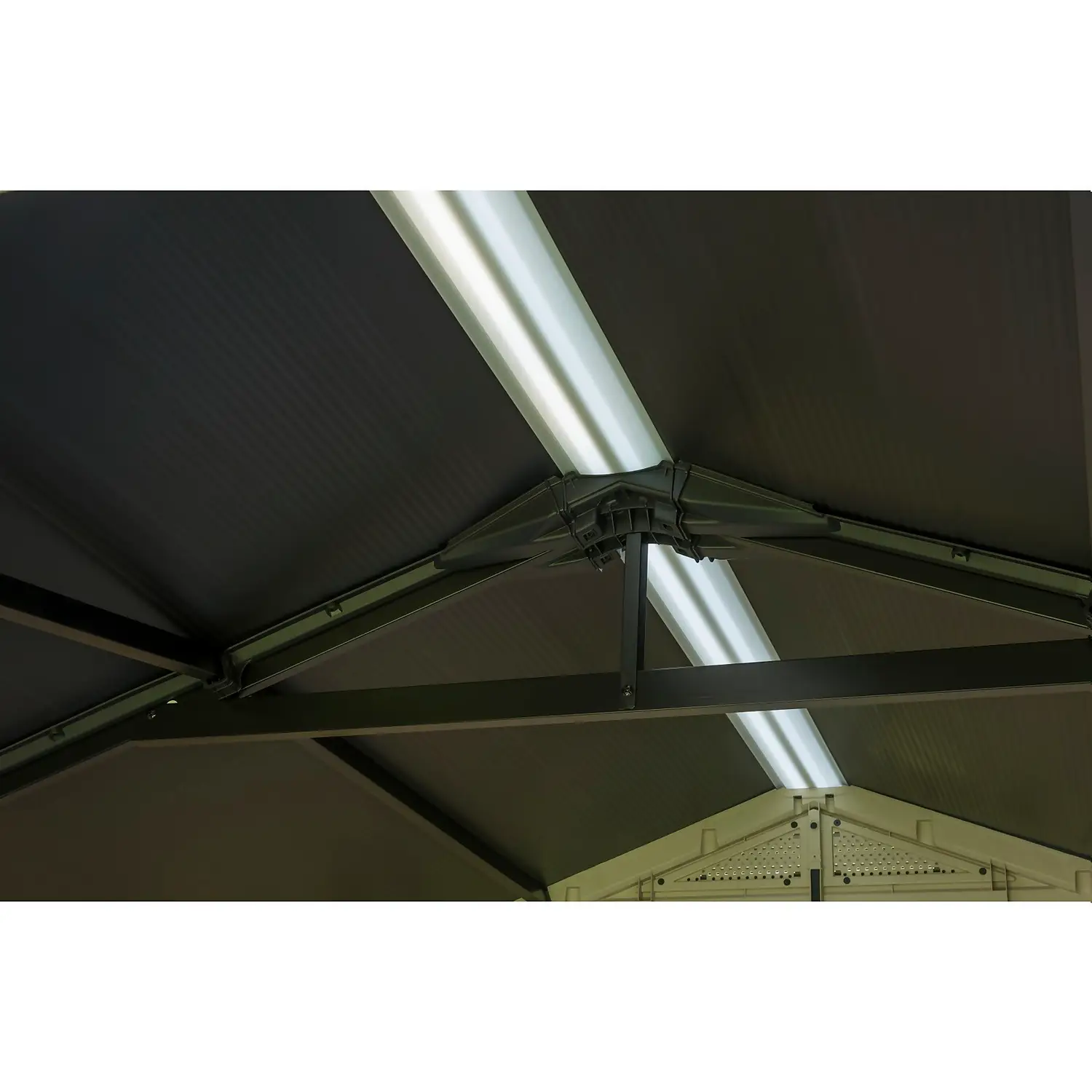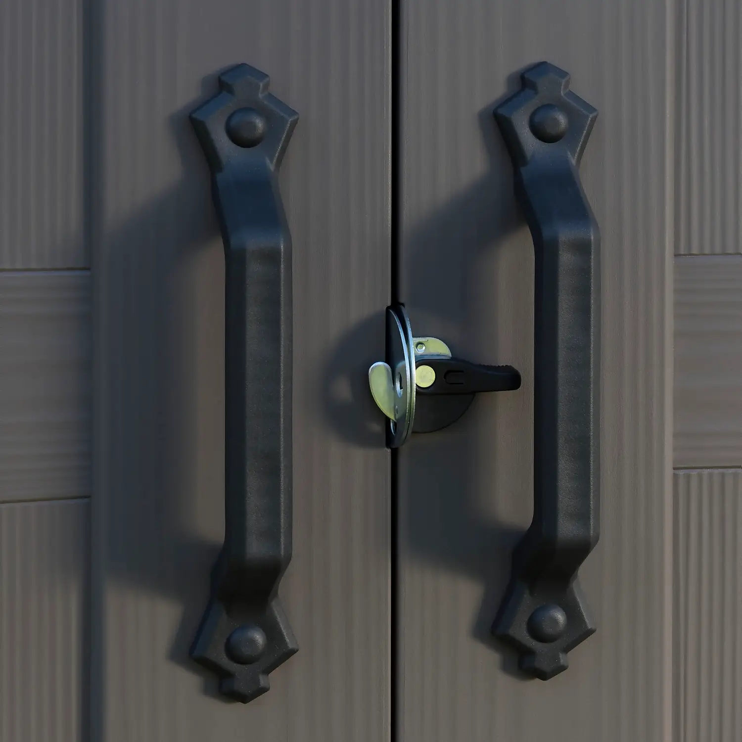 The Factor 8×6 shed gives you ample storage with plenty of convenience. Made from durable weather-resistant resin, this shed won’t rust or rot like wooden sheds, and comes with steel reinforcements for added strength. It features a heavy-duty floor that protects your equipment from water and mud, high-arched double doors that will allow you easy access to the shed contents, and with two shelves are included for instant organized storage. A full-length skylight lets in plenty of natural light, and it’s lockable too, so you can keep your contents safe, day and night.
