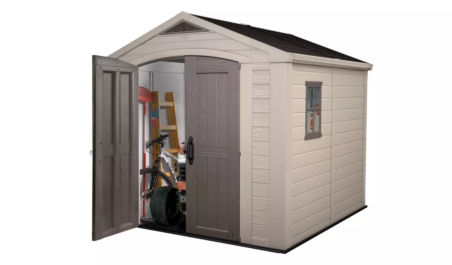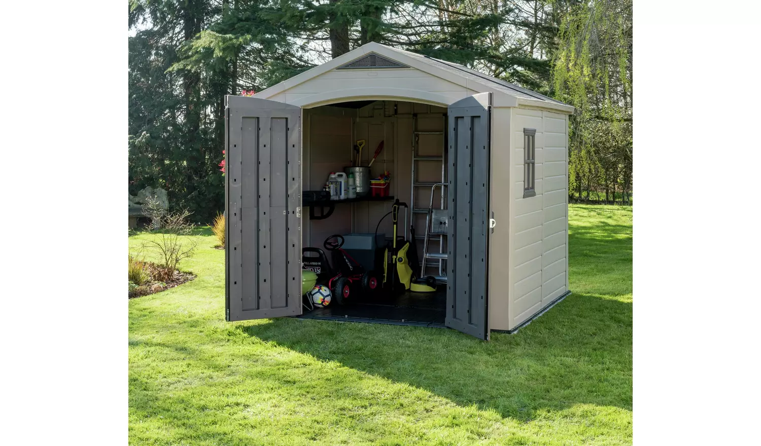 The Keter 8’x8′ Factor Heavy Duty Plastic Garden Shed – Beige will provide ample space for a wide variety of tools and equipment.