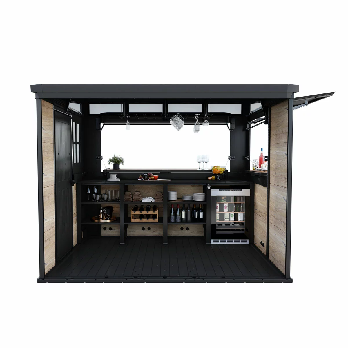 Effortlessly transforming from a compact, secure shed into a full cabana bar, it combines sleek style with smart functionality for gatherings of any size. Featuring dual serving counters with overhead canopies, an overbar glass rack, and dedicated bottle shelving, it keeps everything you need within easy reach.