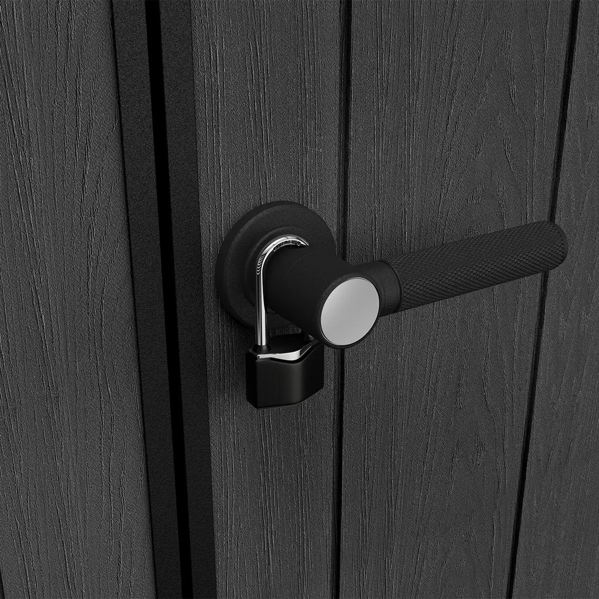 The Keter 9’x 7′ Cortina Heavy Duty Plastic Pent Shed – Dark Grey is modern in every way. With a slanted roof above a band of windows, it boasts a sleek, contemporary design that stores your belongings in eye-catching style. Its double layered walls are made from Evotech, our innovative composite material that gives you the aesthetic look and feel of wood but with the benefits of resin.