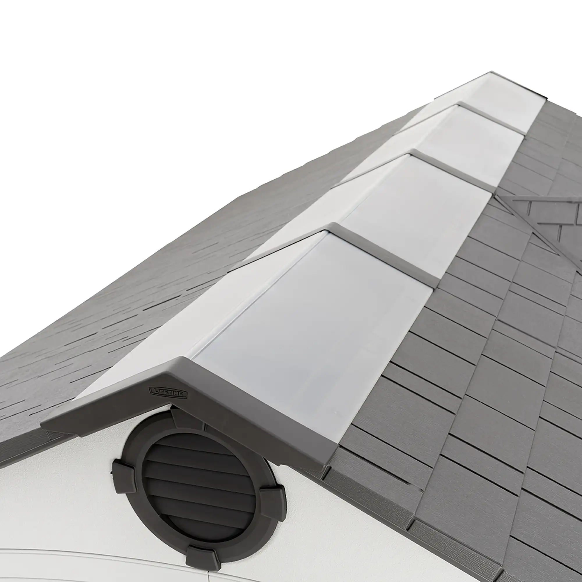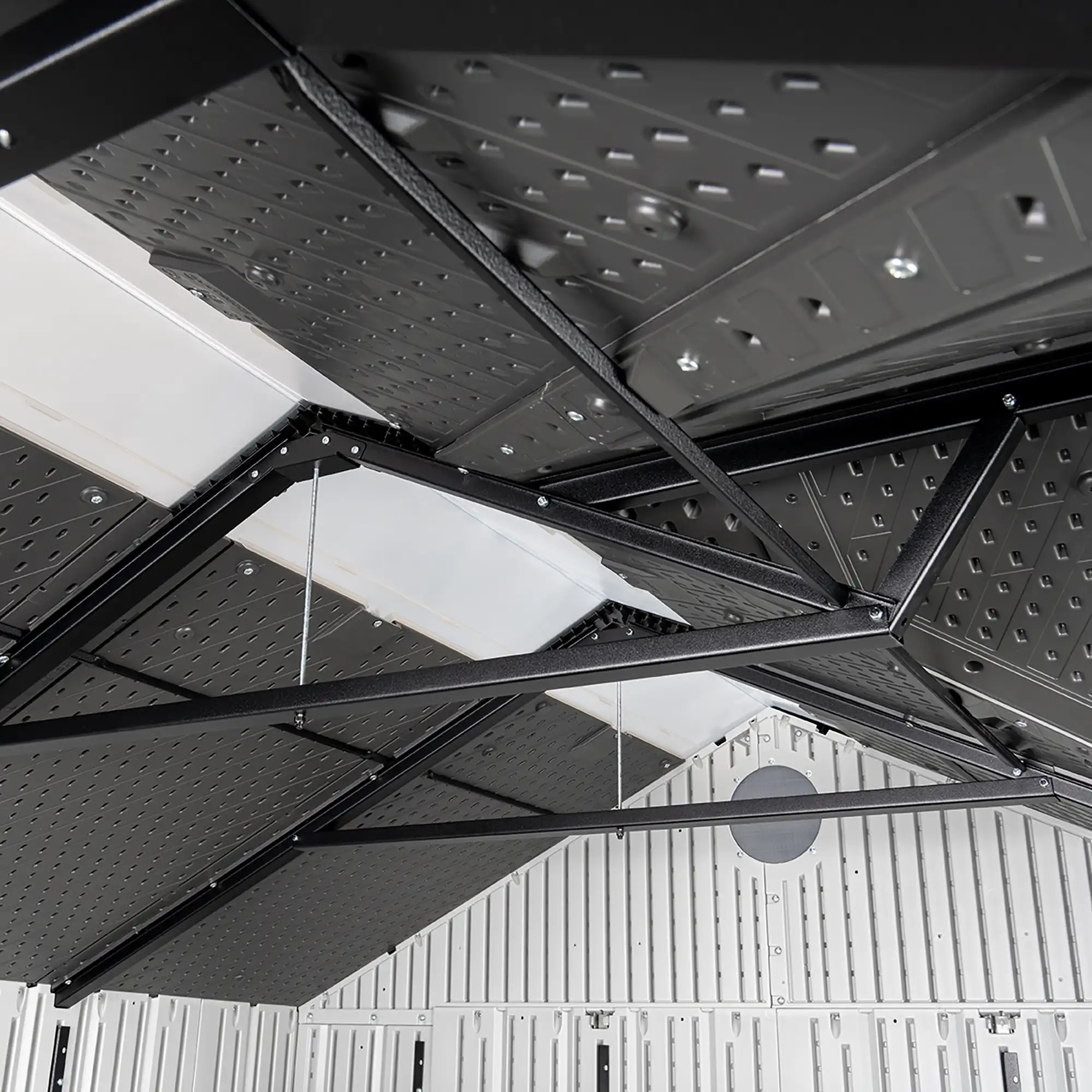 Bask in the natural light granted by panel skylights and secure your goods with a lockable steel latch on the doors. This shed is made with heavy-duty steel trusses, high-density polyethylene, and a sturdy Double Wall System for exceptional strength and reliability.