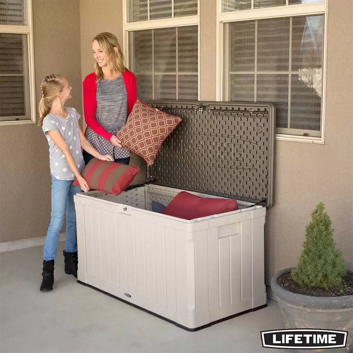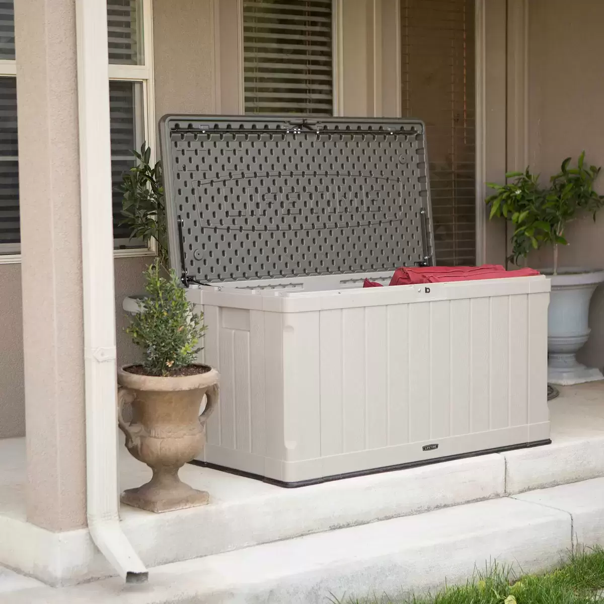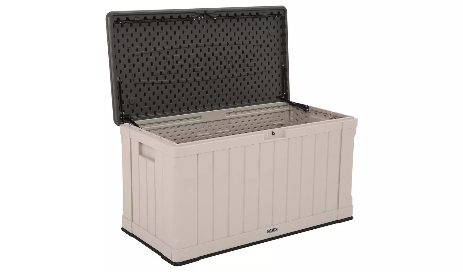 The lid is lockable (lock not included) to provide even greater security and has a controlled spring-hinge for easy opening and closing. It has moulded side handles for easy transport making it easy to move around your yard or patio and it is even sturdy enough to be used as a bench. The Lifetime Deck Box blends durability, convenience and style to create a versatile storage solution.