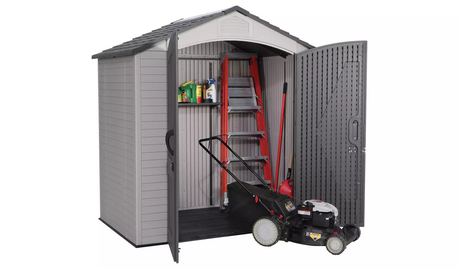 The Lifetime 7’x4.5′ Heavy Duty Plastic Storage Shed is a 6ft wide apex roofed shed with a built in floor and Large double doors.