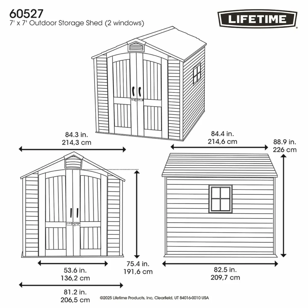 Feel confident storing all your equipment with lockable doors (lock not included) and set up the perfect storage arrLifetime 7×7 Heavy Duty Plastic Shed – New Look Grey Model X60527angement for you with adjustable shelves. The Lifetime Shed features an attractive design with textured panels and gable to look great no matter where you put it. Give your garden a shed that’s the perfect blend of function and fashion and make outdoor storage woes a thing of the past with the Lifetime Outdoor Storage Shed!
