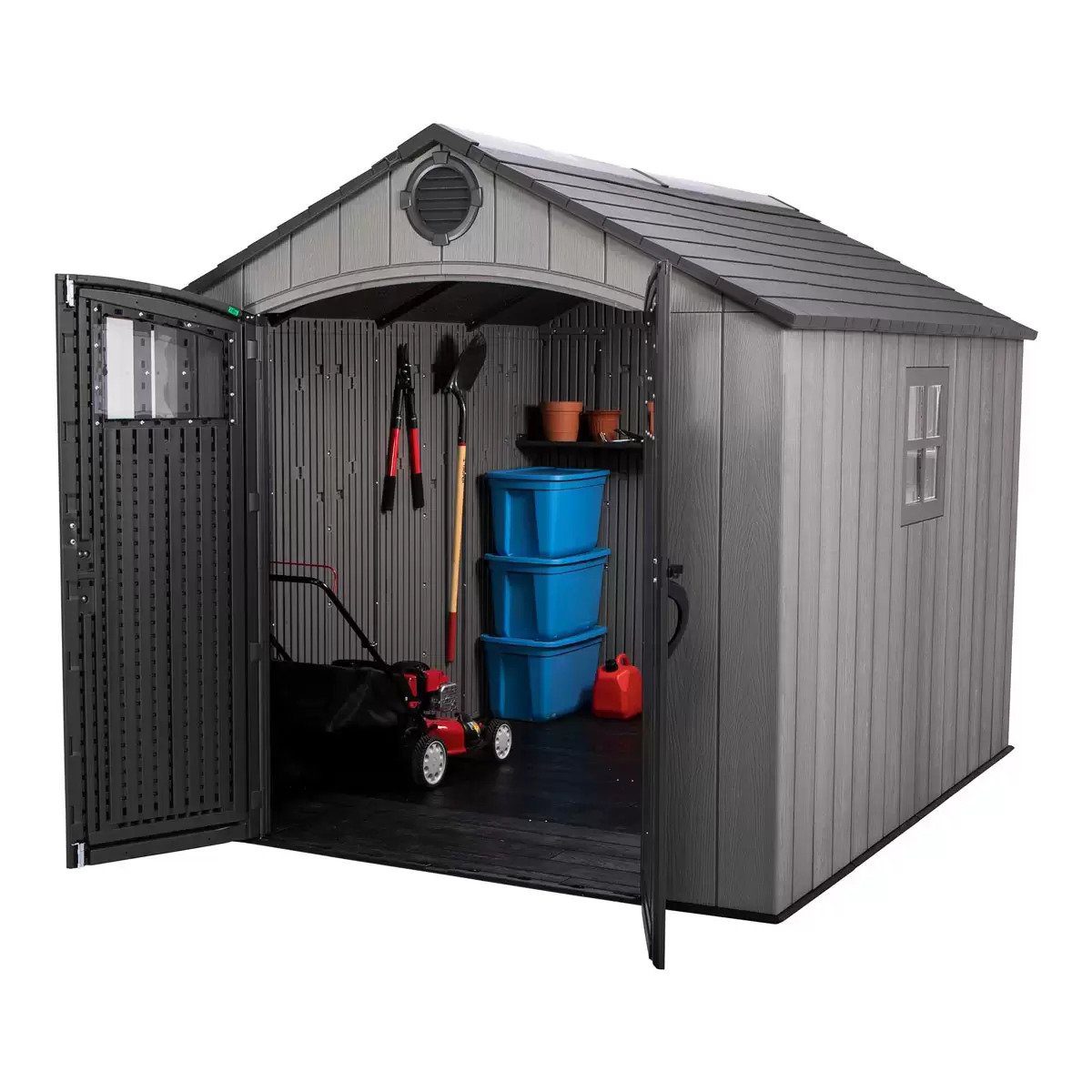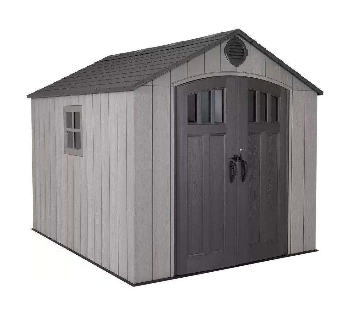 The Lifetime 8×10 Heavy Duty Plastic Shed – Storm Dust has  several innovative features, including 4-panel skylights for natural interior lighting. They also include single-hinged double doors that open nearly 180 degrees and lock closed, a slip-resistant polyethylene floor, and low-maintenance, steel-reinforced construction.