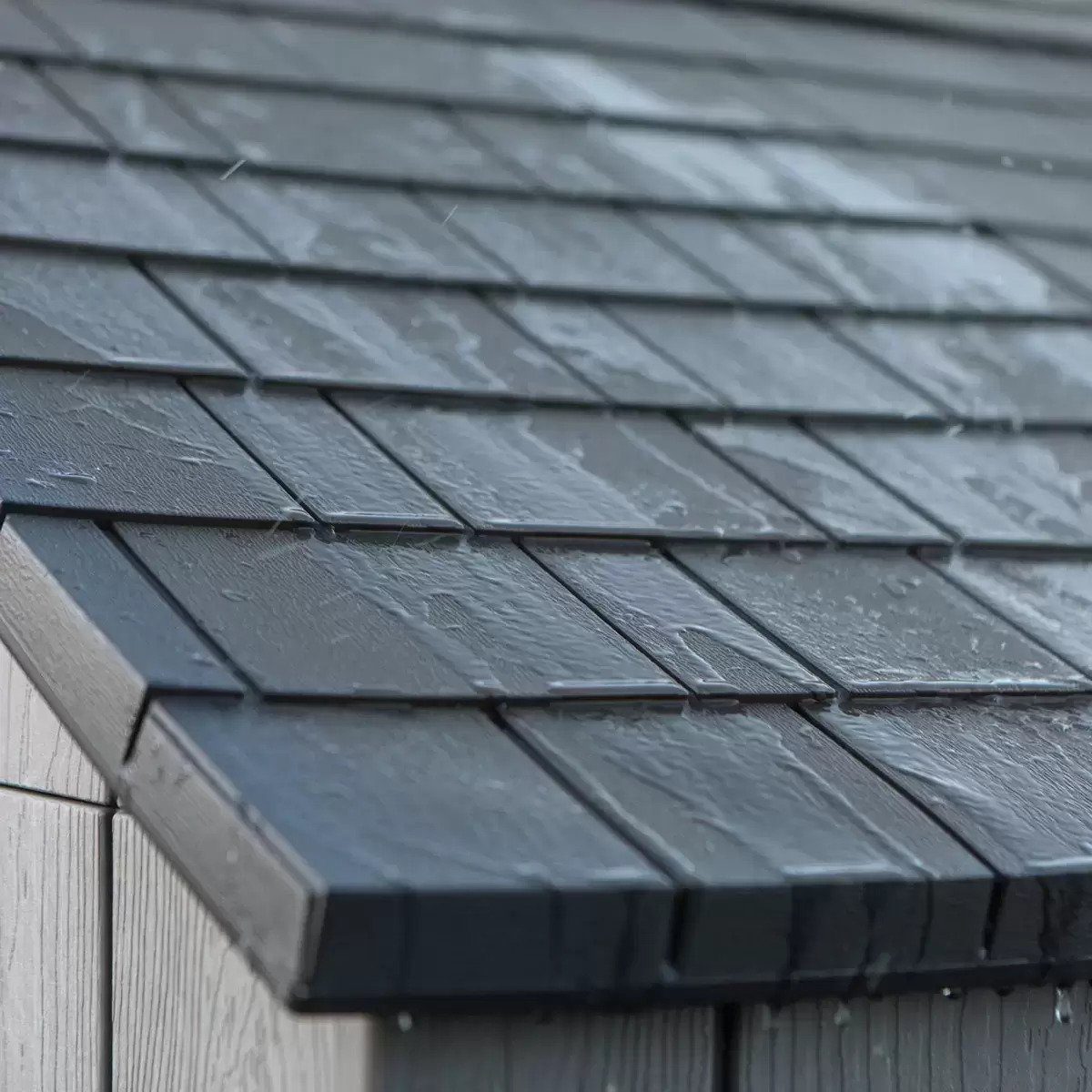 High-pitched roof allows for quick drainage of rain and snow