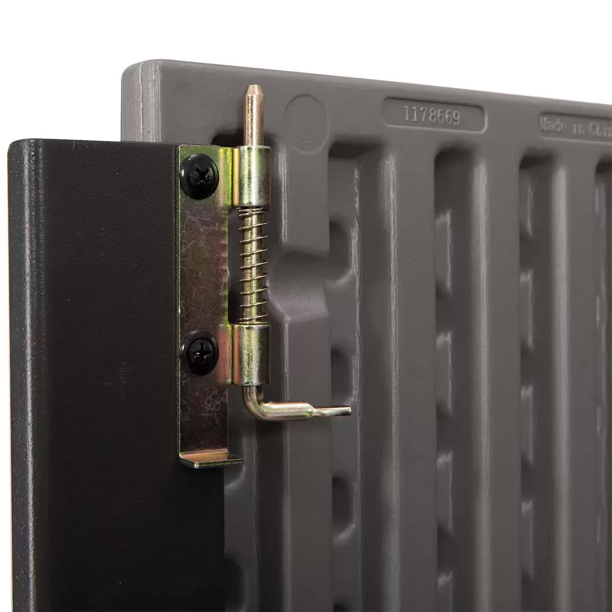 There are high impact handles with metal latch and an exterior padlock loop with two deadbolts on interior of left door (padlock not included). The heavy duty floor panel and weather resistant steel hinges ensure that any contents remain dry, secure and ventilated. The UV protected panels will not fade, crack or peel and will provide you with years of low maintenance storage space and the attractive design will make the perfect addition to your garden, patio or driveway.