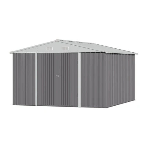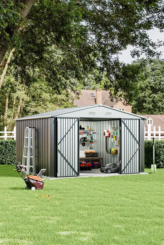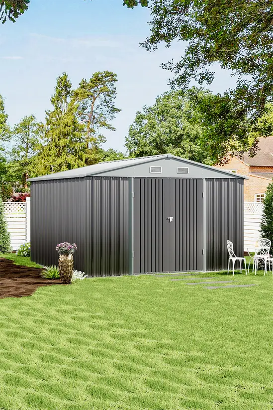 The Living and Home 10×8 Double Hinged Apex Metal Shed – Grey is the perfect storage solution for your valuable gardening and outdoor tools.