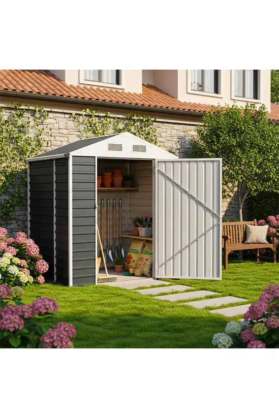 Keep your outdoor space tidy and organised with this stylish Living and Home 5.5’x4′ Metal Apex Roof Garden Tool Storage Shed – Anthracite and White.
