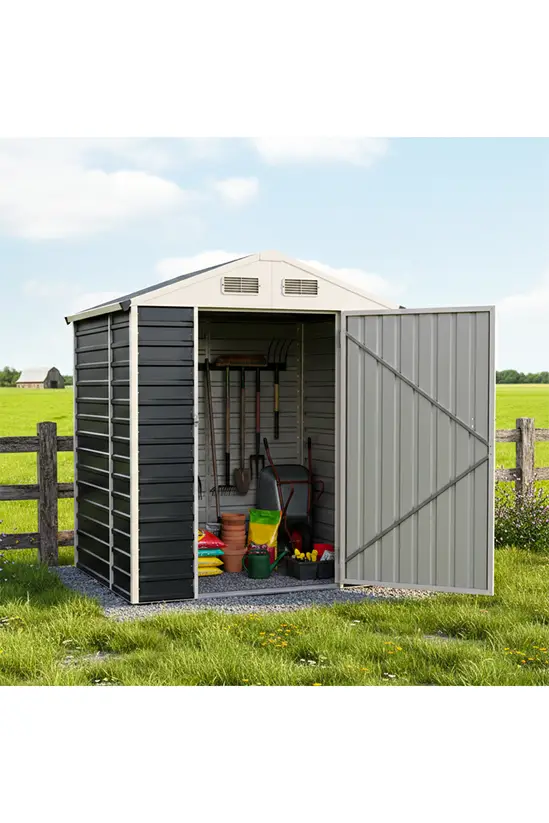 It features corrugated panels that boost structural strength while adding sleek lines and industrial charm. An elegant apex roof ensures efficient rainwater runoff and provides generous headroom for taller tools or equipment. Inside, a spacious layout can be customised to store garden tools or seasonal items with ease. Practical and efficient, it is a reliable solution for all your outdoor storage needs.
