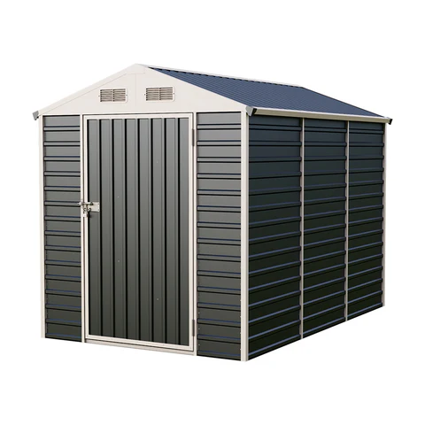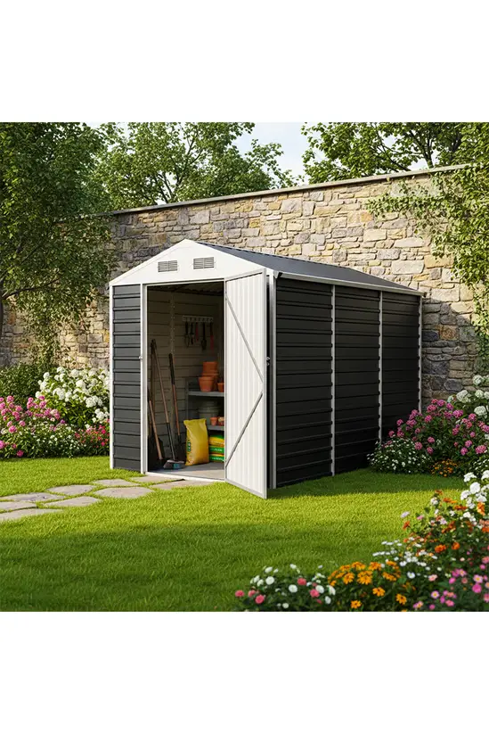 Keep your outdoor space tidy and organised with this stylish Living and Home 5.5’x8′ Metal Apex Roof Garden Tool Storage Shed – Anthracite and White.