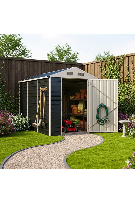 It features corrugated panels that boost structural strength while adding sleek lines and industrial charm. An elegant apex roof ensures efficient rainwater runoff and provides generous headroom for taller tools or equipment. Inside, a spacious layout can be customised to store garden tools or seasonal items with ease. Practical and efficient, it is a reliable solution for all your outdoor storage needs.