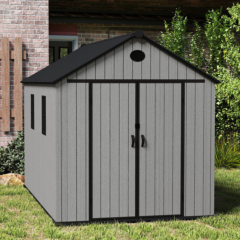 Organise your garden with the Living and Home 7.5′ x11′ WoodField Woodgrain Plastic Apex Shed – Light Grey .