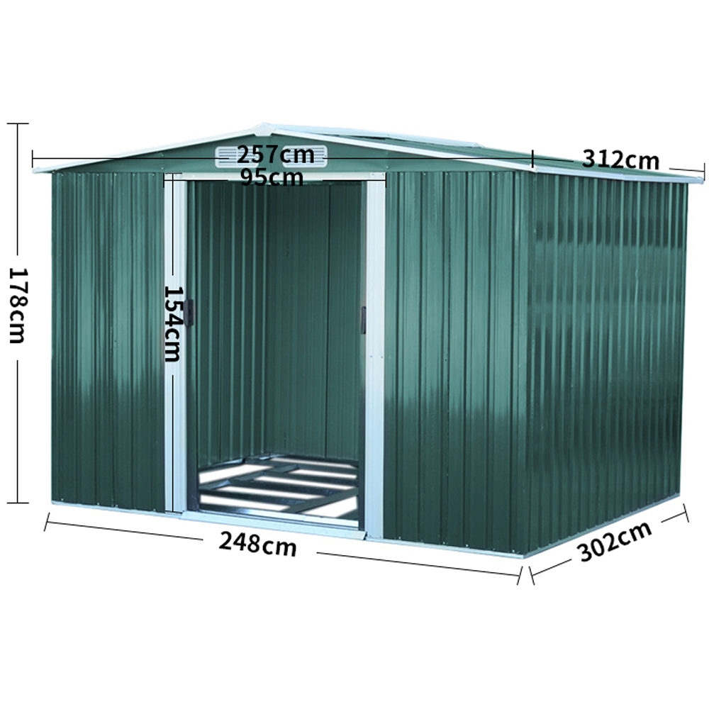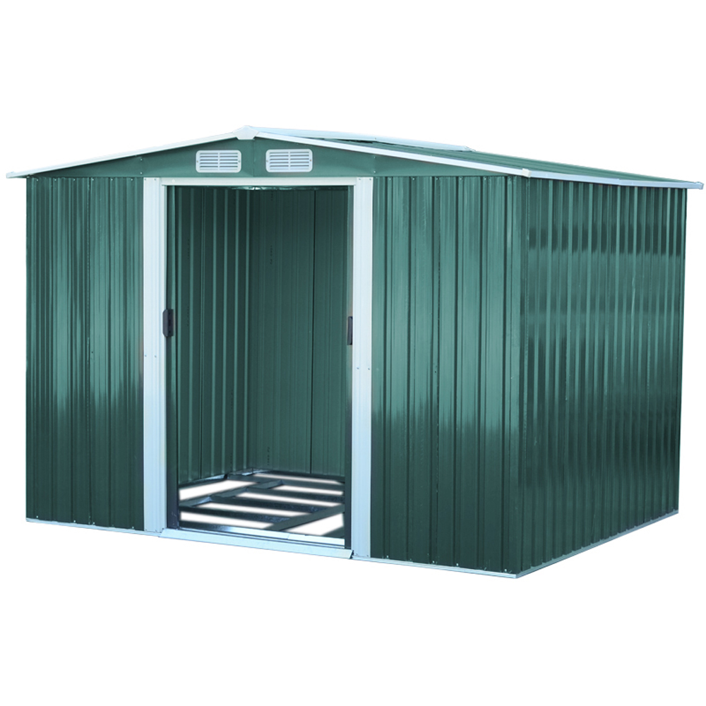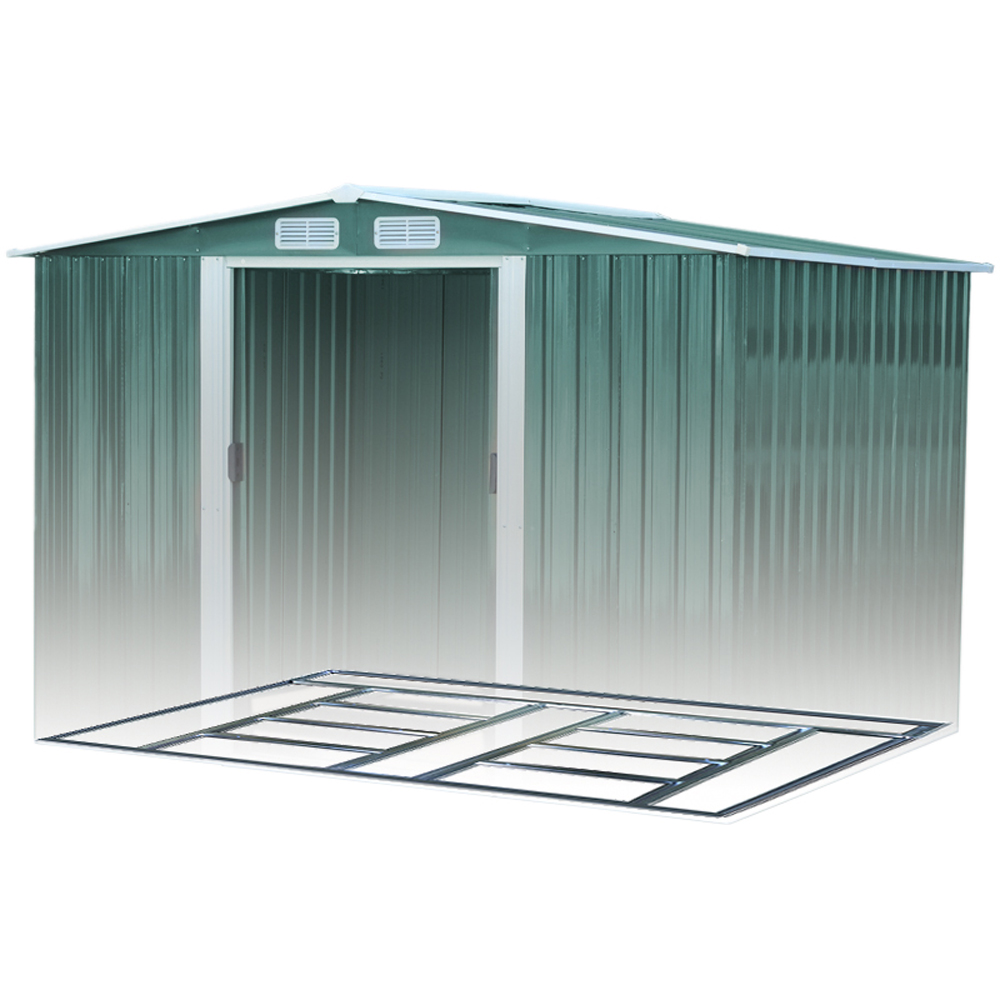 Bring modern style and lasting order to your garden with this streamlined Living and Home 8×10 Apex Metal Shed with Foundation Grid – Green .
