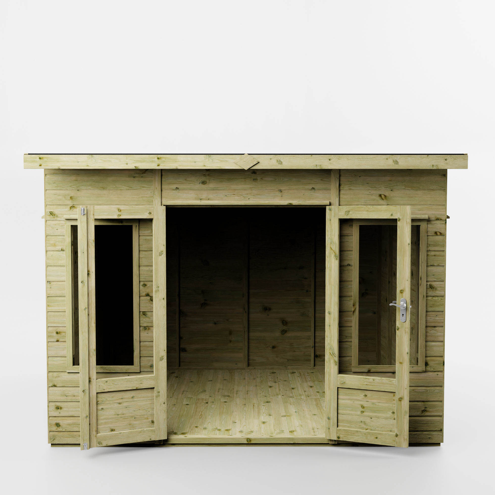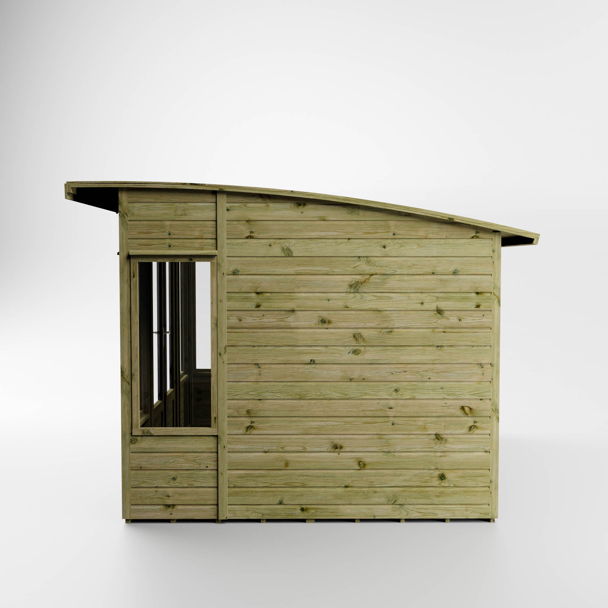 The Mercia 10’x 8′ Premium Helios Green Dipped Treatment Traditional Summerhouse – Curved Roof boasts a stunning, contemporary curved roofline that is sure to become a focal feature within your garden. With styrene glazed windows and French doors, the interior fills with light to create a bright and airy space. Whether you’re looking for an arts and crafts room or somewhere to spend summer evenings, the Helios could be a perfect fit!