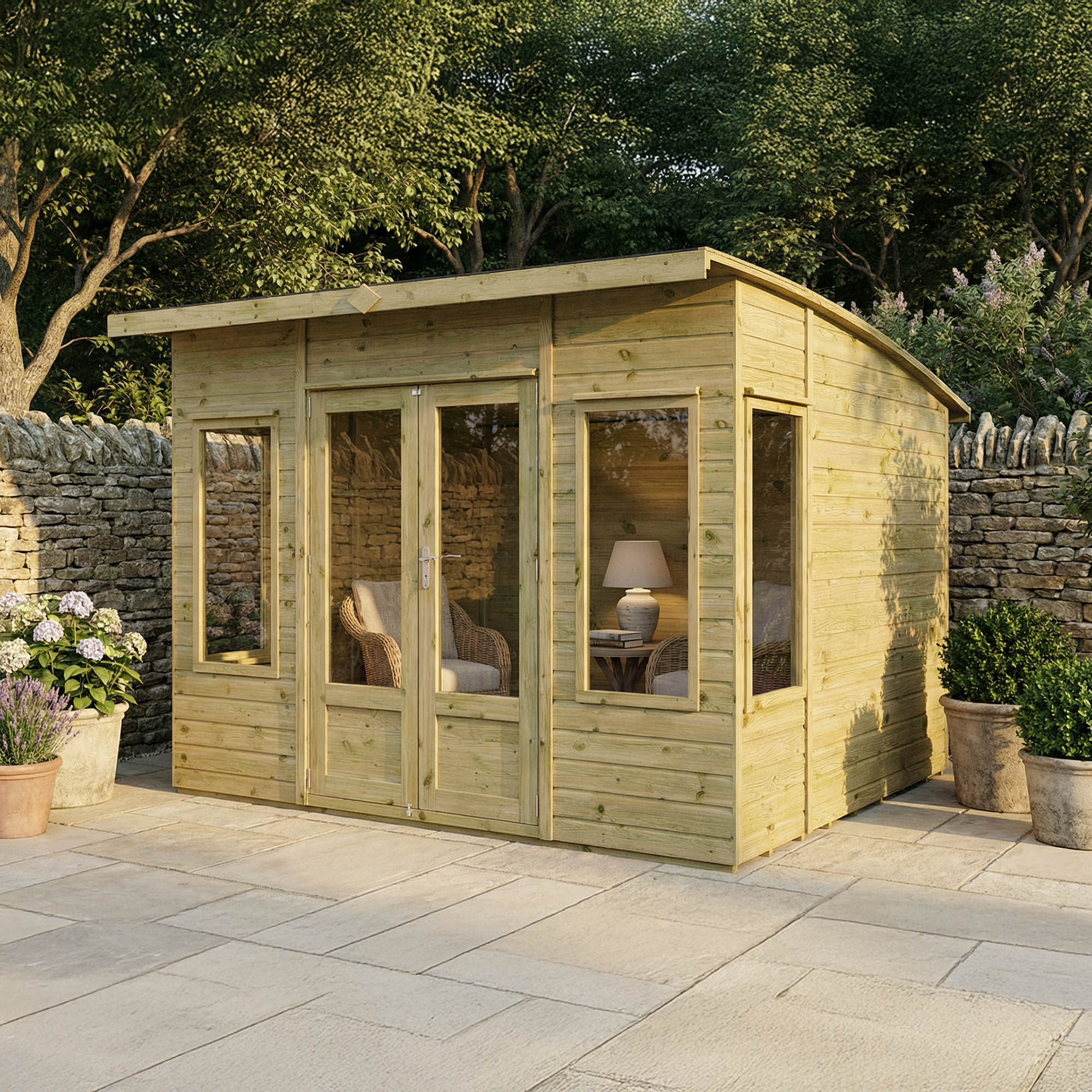 The Mercia 10’x 8′ Premium Helios Green Dipped Treatment Traditional Summerhouse – Curved Roof  provides a large open space to relax in on a bright summer’s day.