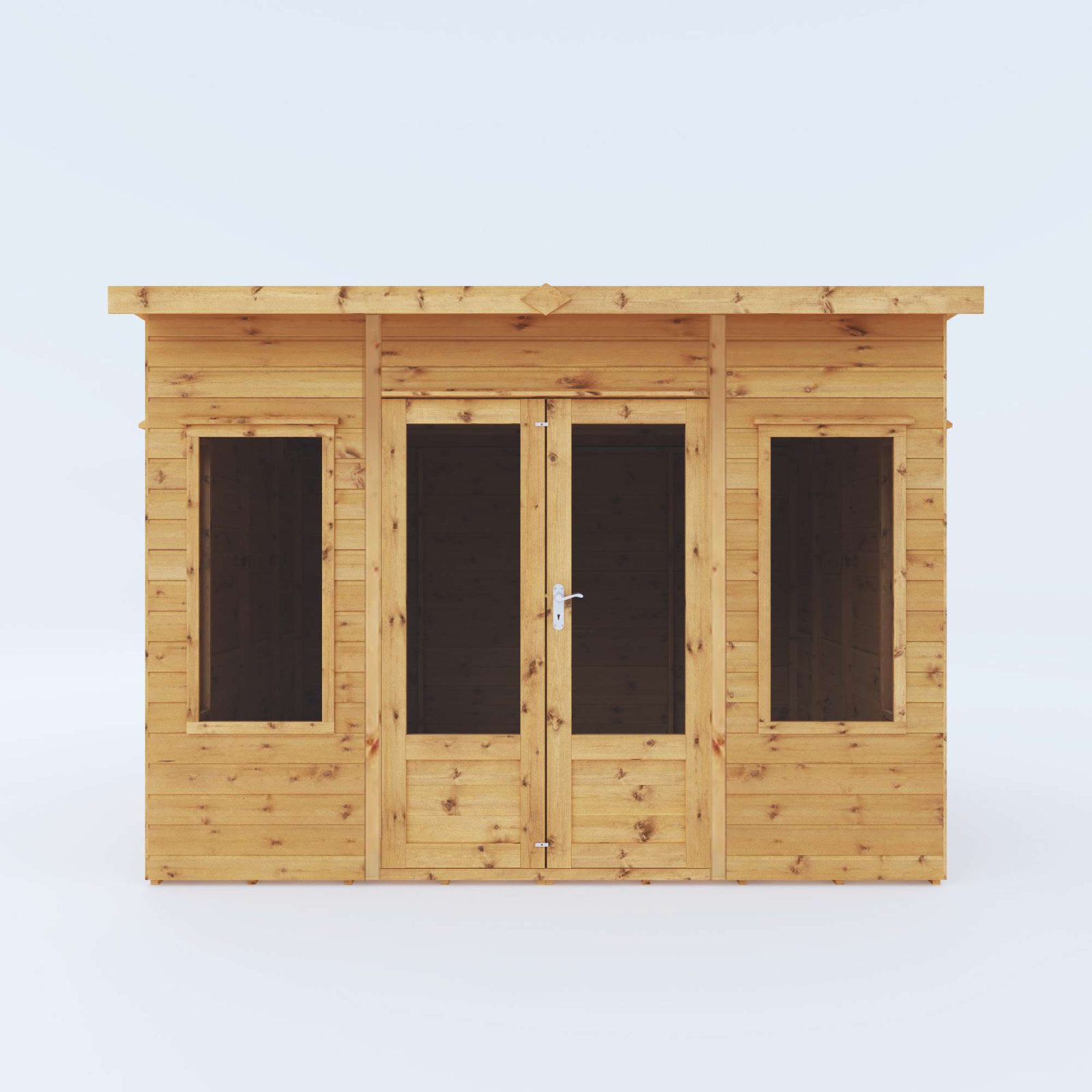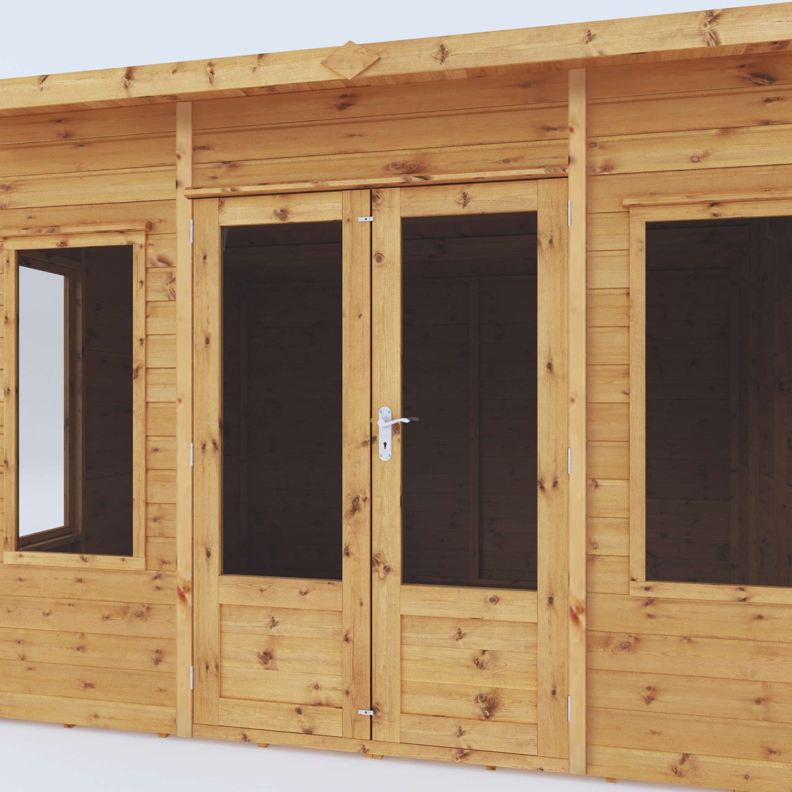 The Mercia 10’x 8′ Premium Helios Traditional Summerhouse – Curved Roof boasts a stunning, contemporary curved roofline that is sure to become a focal feature within your garden. With styrene glazed windows and French doors, the interior fills with light to create a bright and airy space. Whether you’re looking for an arts and crafts room or somewhere to spend summer evenings, the Helios could be a perfect fit!