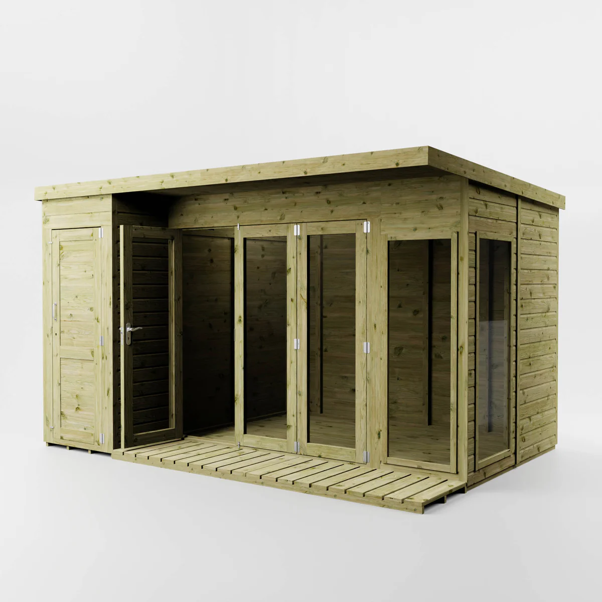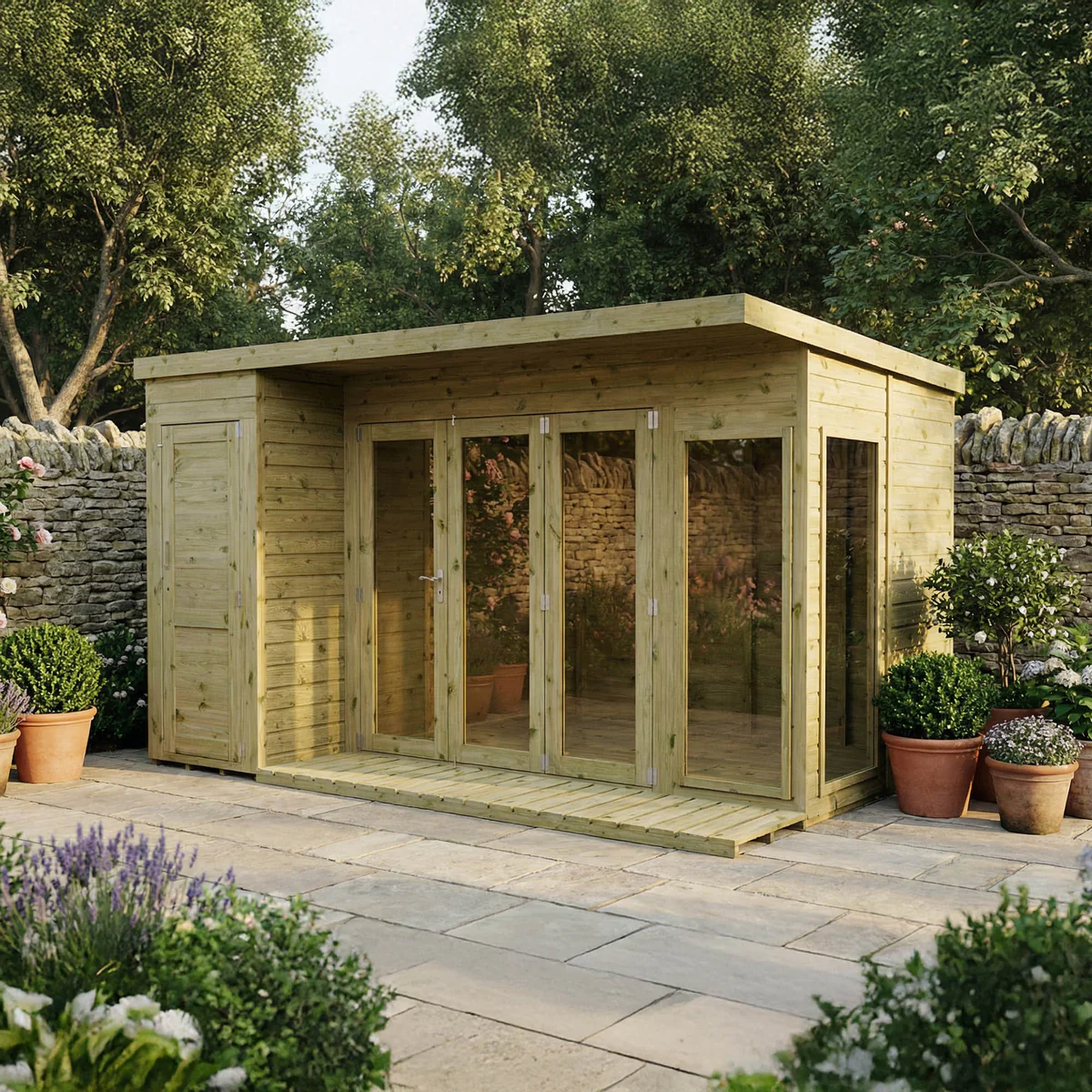 The Mercia 12 x 8 Premium Green Dipped Treatment Garden Room Summerhouse with Side Shed has a twist on traditional 1950’s style, making it a great addition to any garden space.