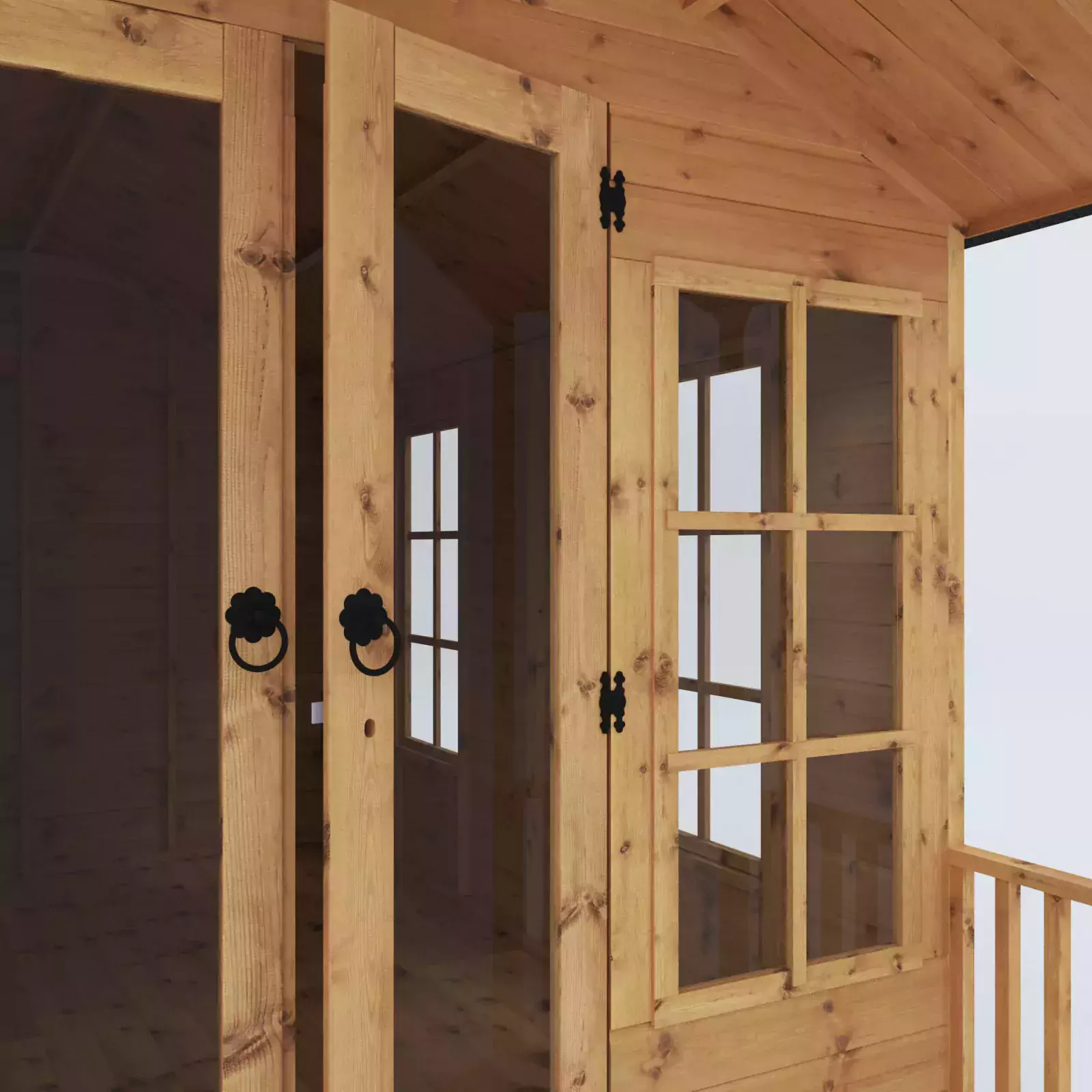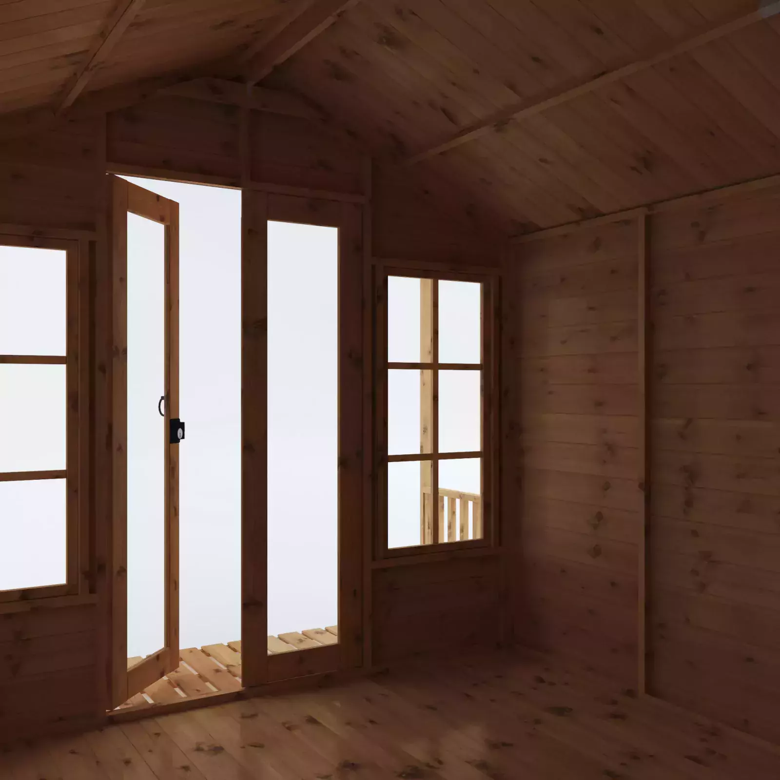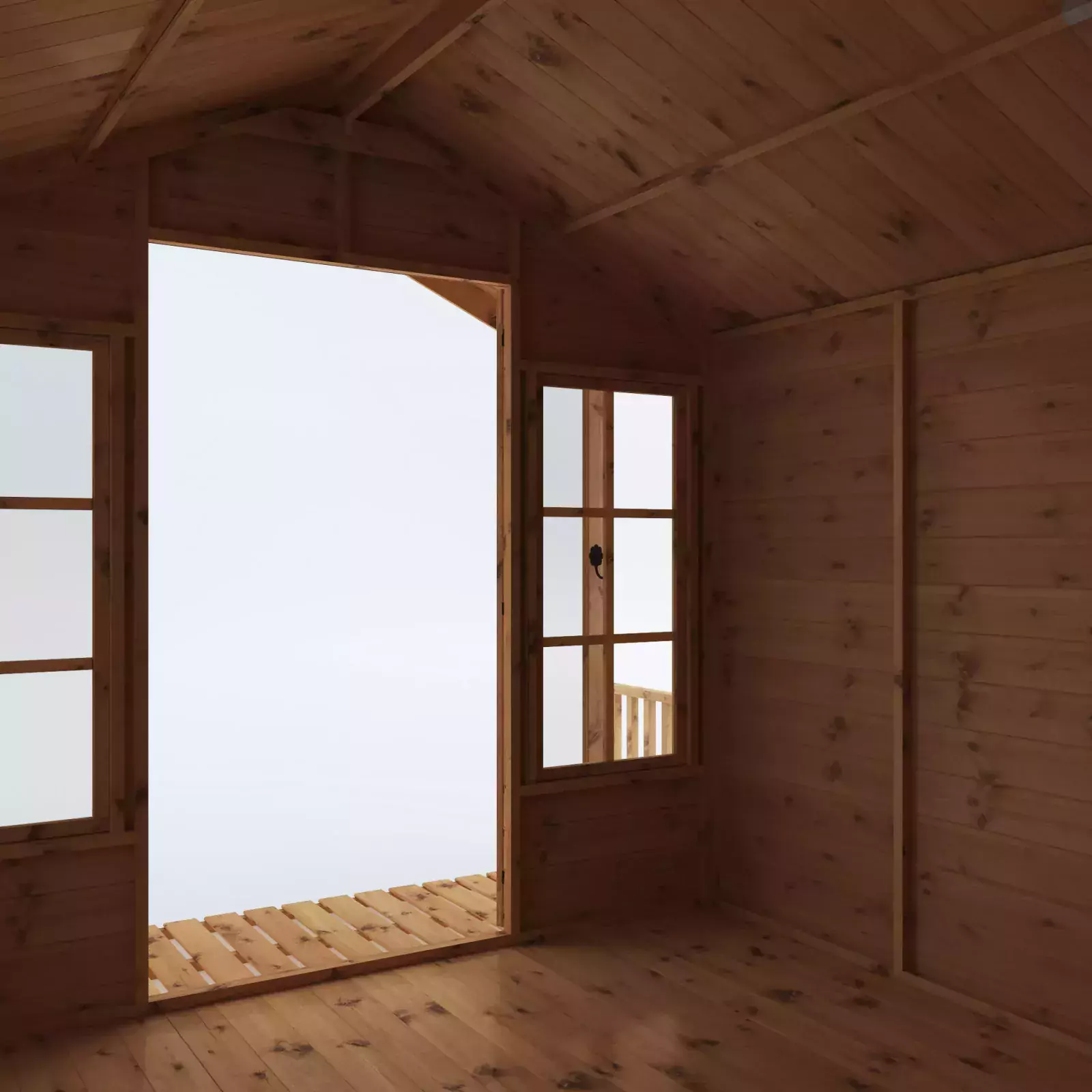 Four large styrene glazed windows allow light to flood the interior, and styrene glazed French doors open out onto the sheltered veranda, creating a light, airy and welcoming space to enjoy. The walls are constructed using premium horizontal interlocking tongue and groove boards with a shiplap profile.
