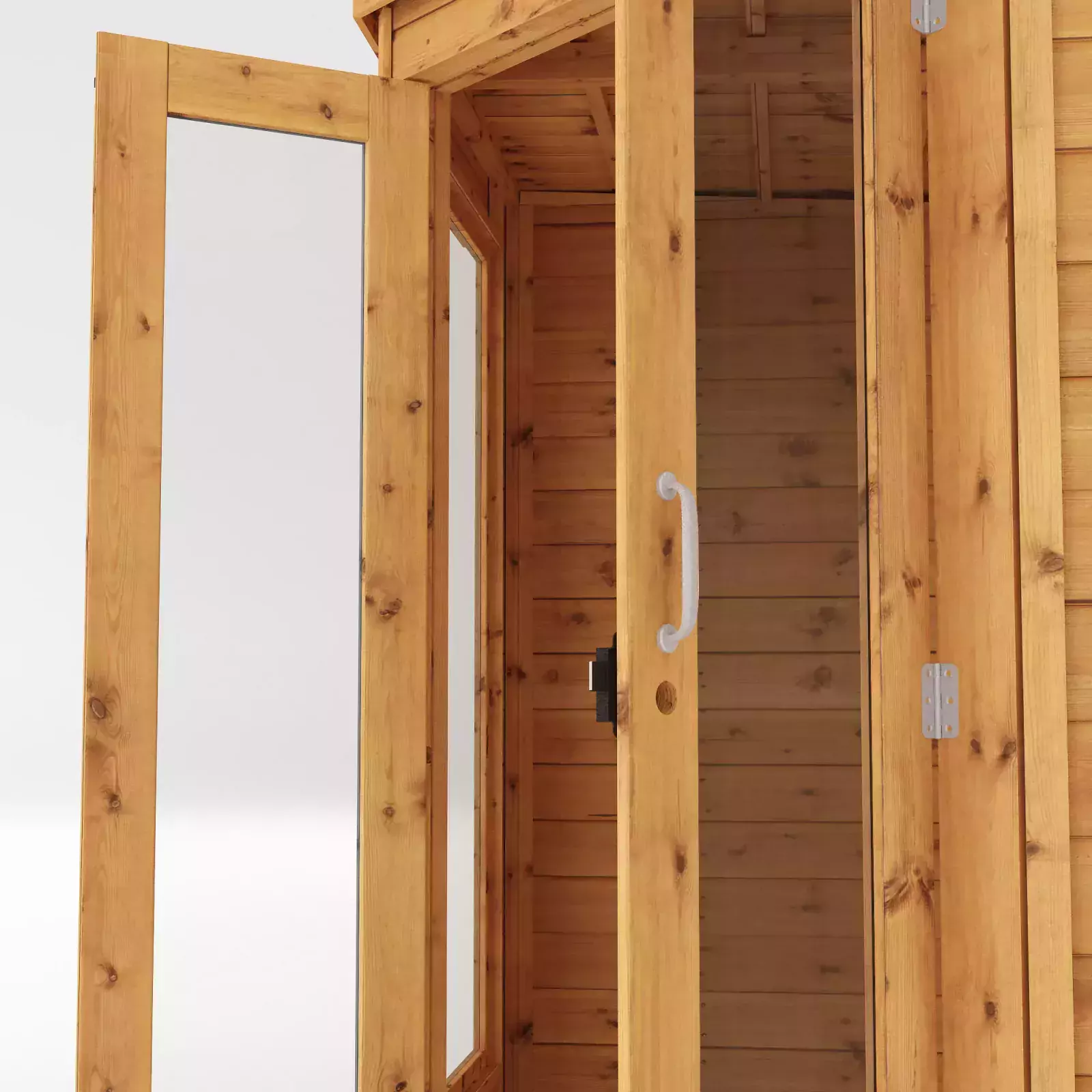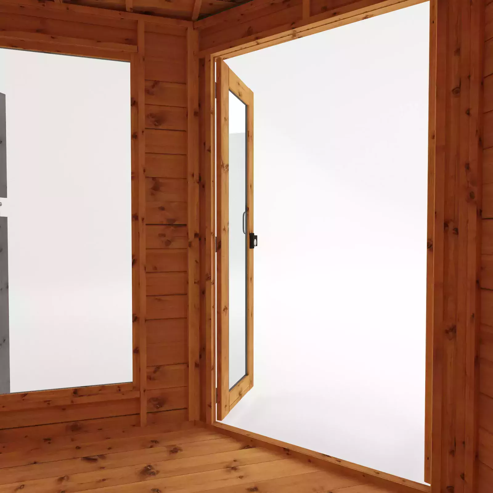Featuring a large side shed, this Mercia summerhouse is perfect for those who need some storage in their back garden, but can’t justify buying a completely separate building. The shed-part of the building also boasts double doors, which make for an exceptionally user-friendly storage facility. These doors are fitted with a padbolt (padlock not included) to keep stored items completely safe.
