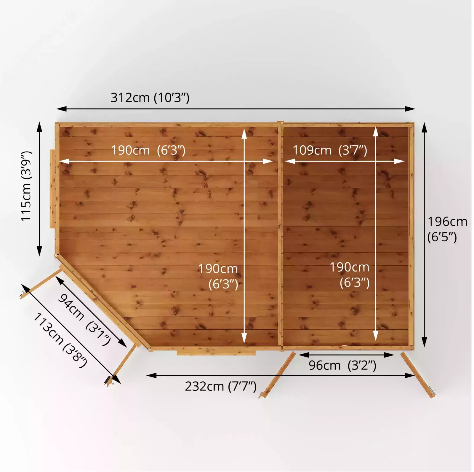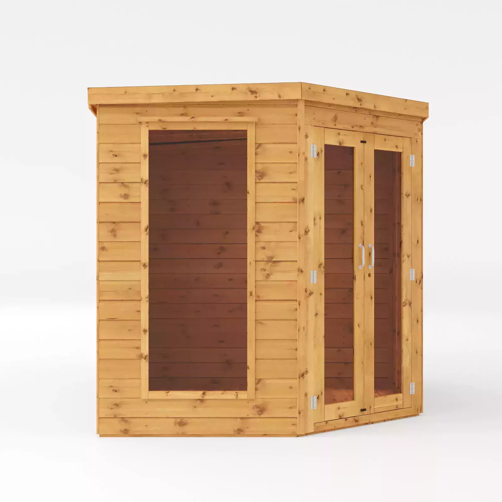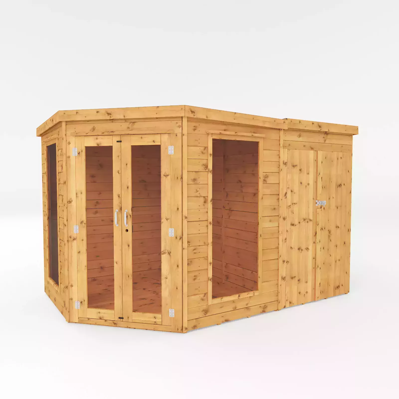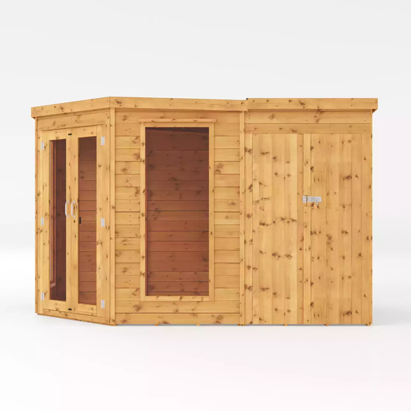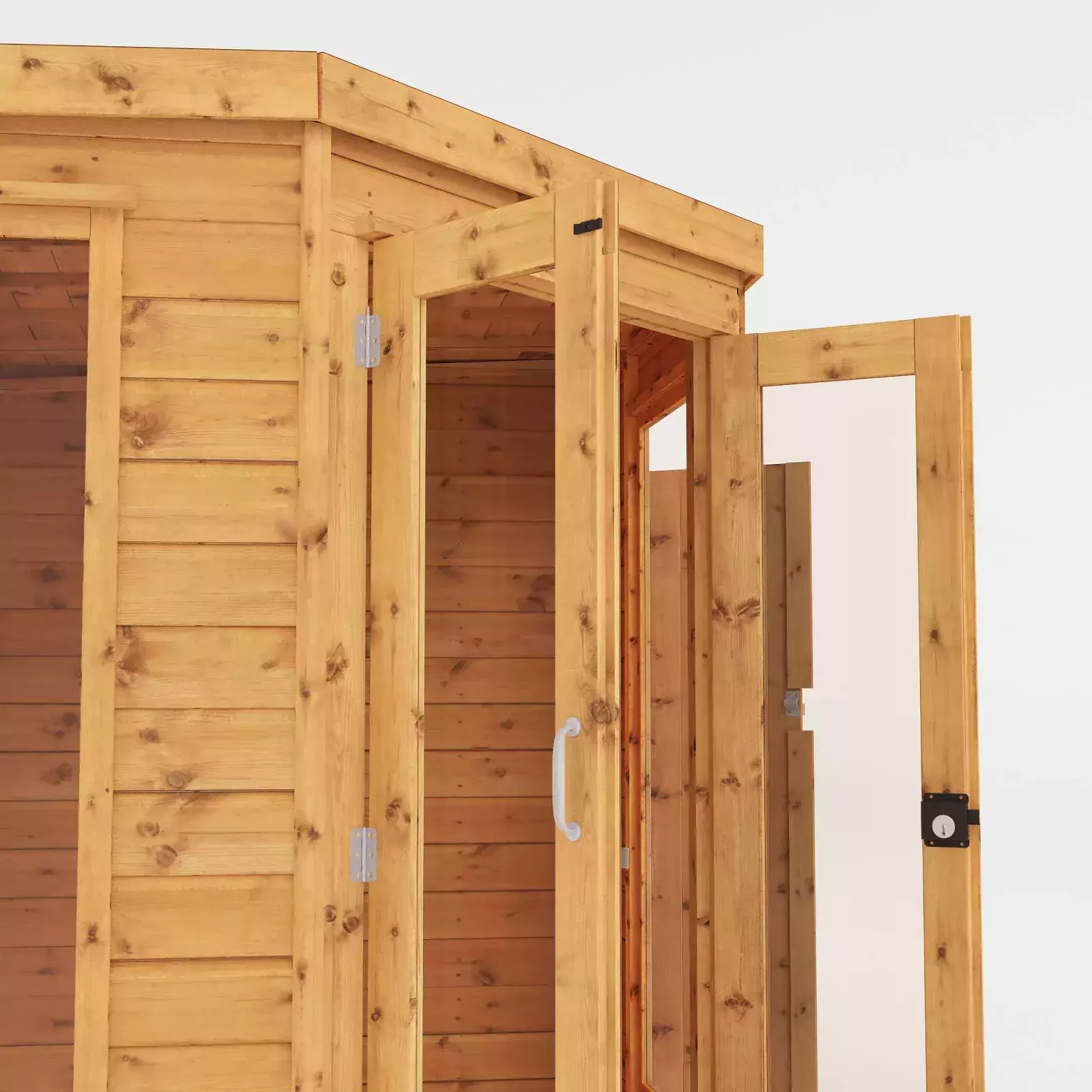 The Mercia 7’x 11′ Premium Corner Summerhouse and Side Shed is the perfect retreat to relax and unwind in your garden, all year round. Its unique pentagonal design fits neatly into the corner of your garden, helping you make the most of your space. It boasts a sturdy build with 12mm tongue and groove cladding to the roof and floor, dip treated timber, plus sand felt roofing for durability and resistance to the elements.