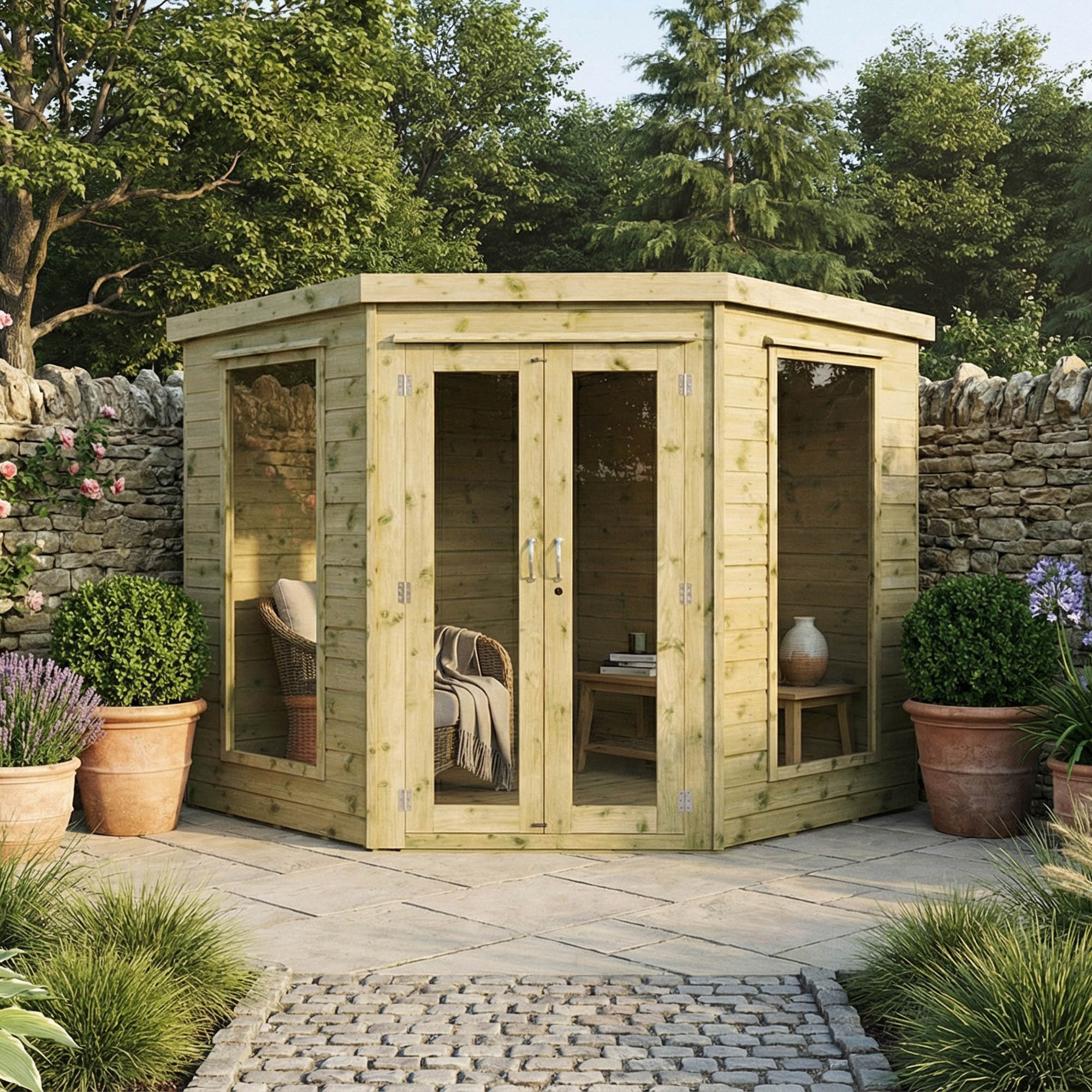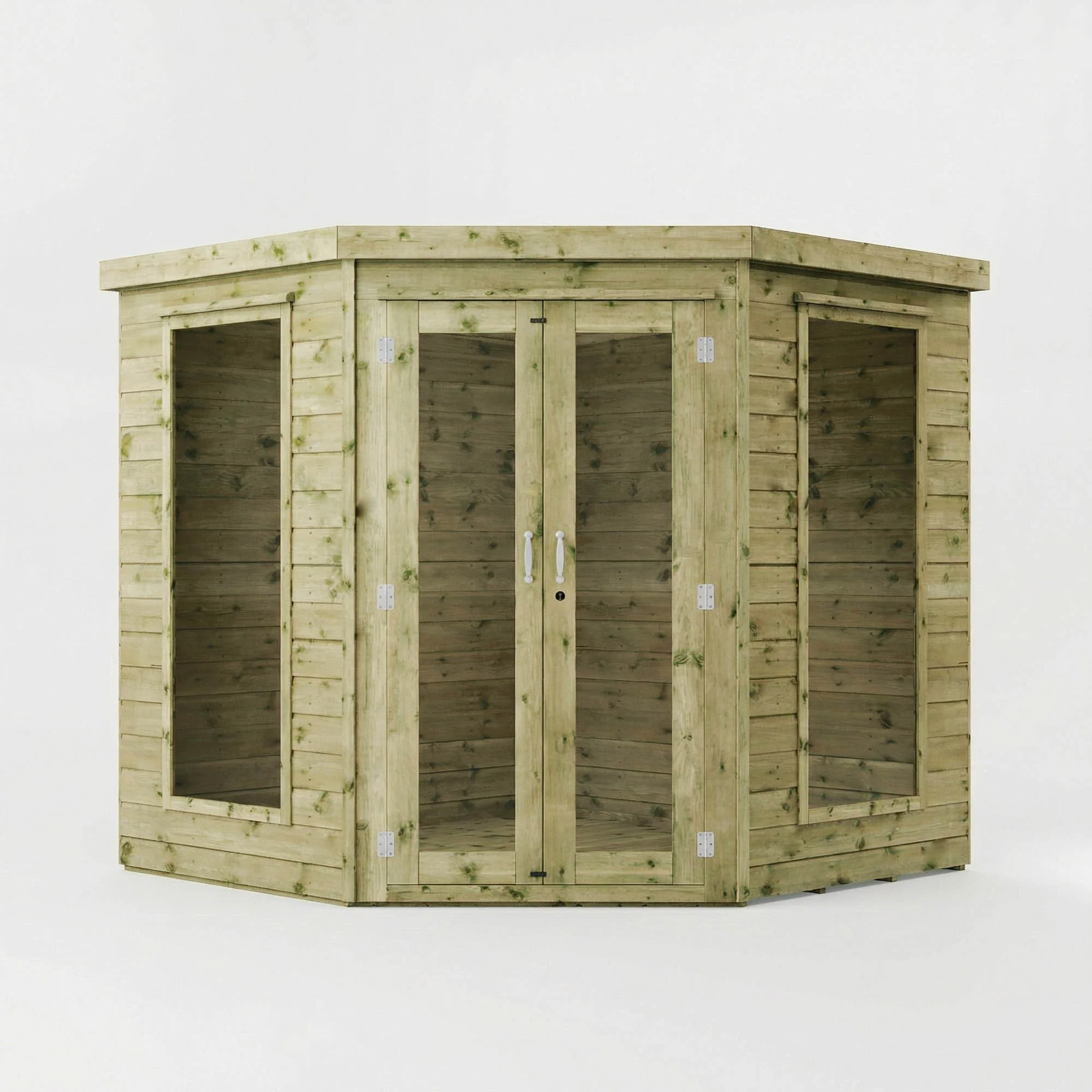 The Mercia 7’x 7′ Premium Green Dipped Treatment Corner Summerhouse provides a large open space to relax in on a bright summer’s day.
