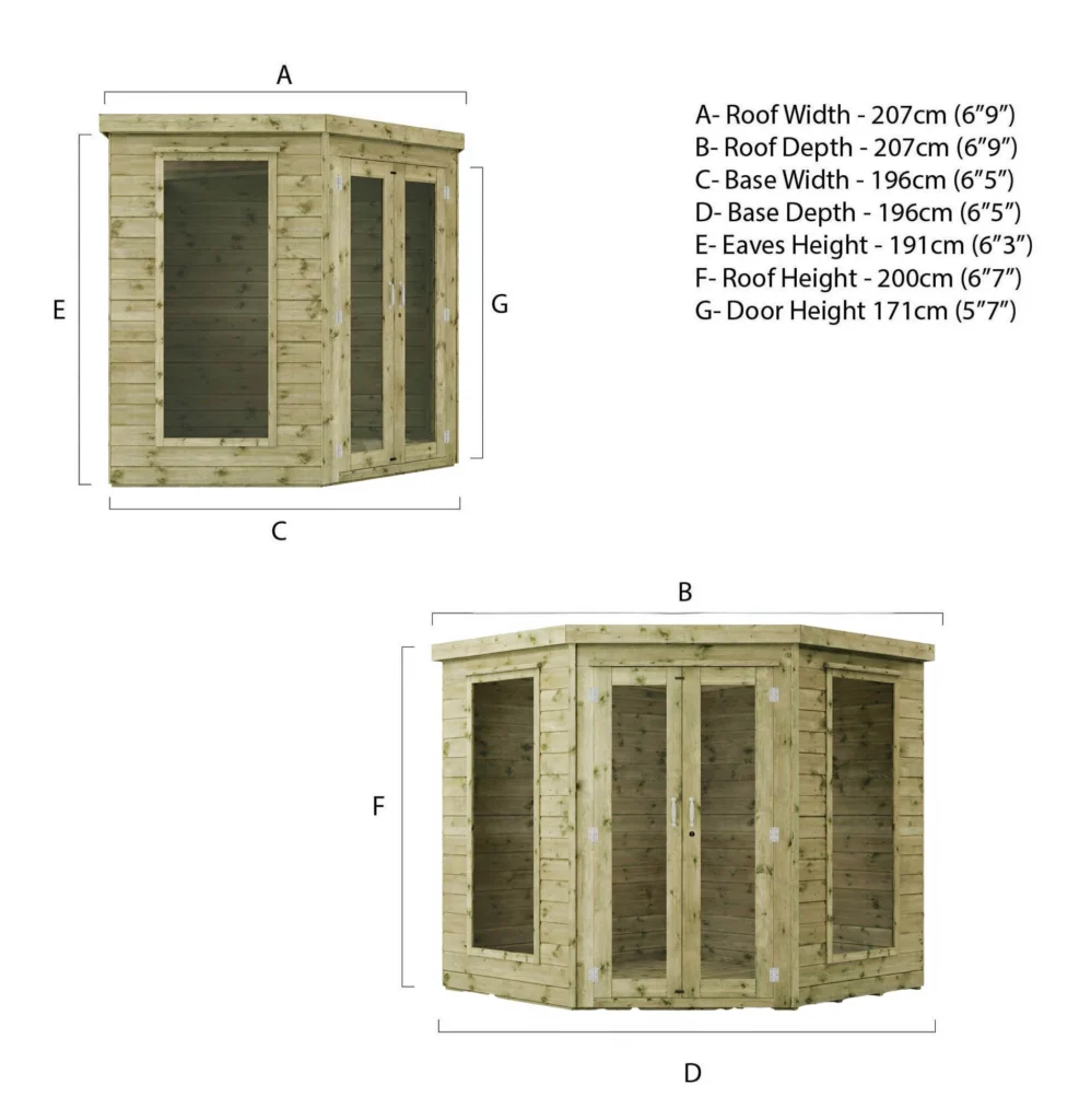 The Mercia 7’x 7′ Premium Green Dipped Treatment Corner Summerhouse is the perfect retreat to relax and unwind in your garden, all year round. Its unique pentagonal design fits neatly into the corner of your garden, helping you make the most of your space. It boasts a sturdy build with 12mm tongue and groove cladding to the roof and floor, dip treated timber, plus sand felt roofing for durability and resistance to the elements.
