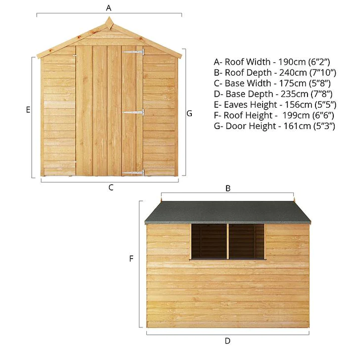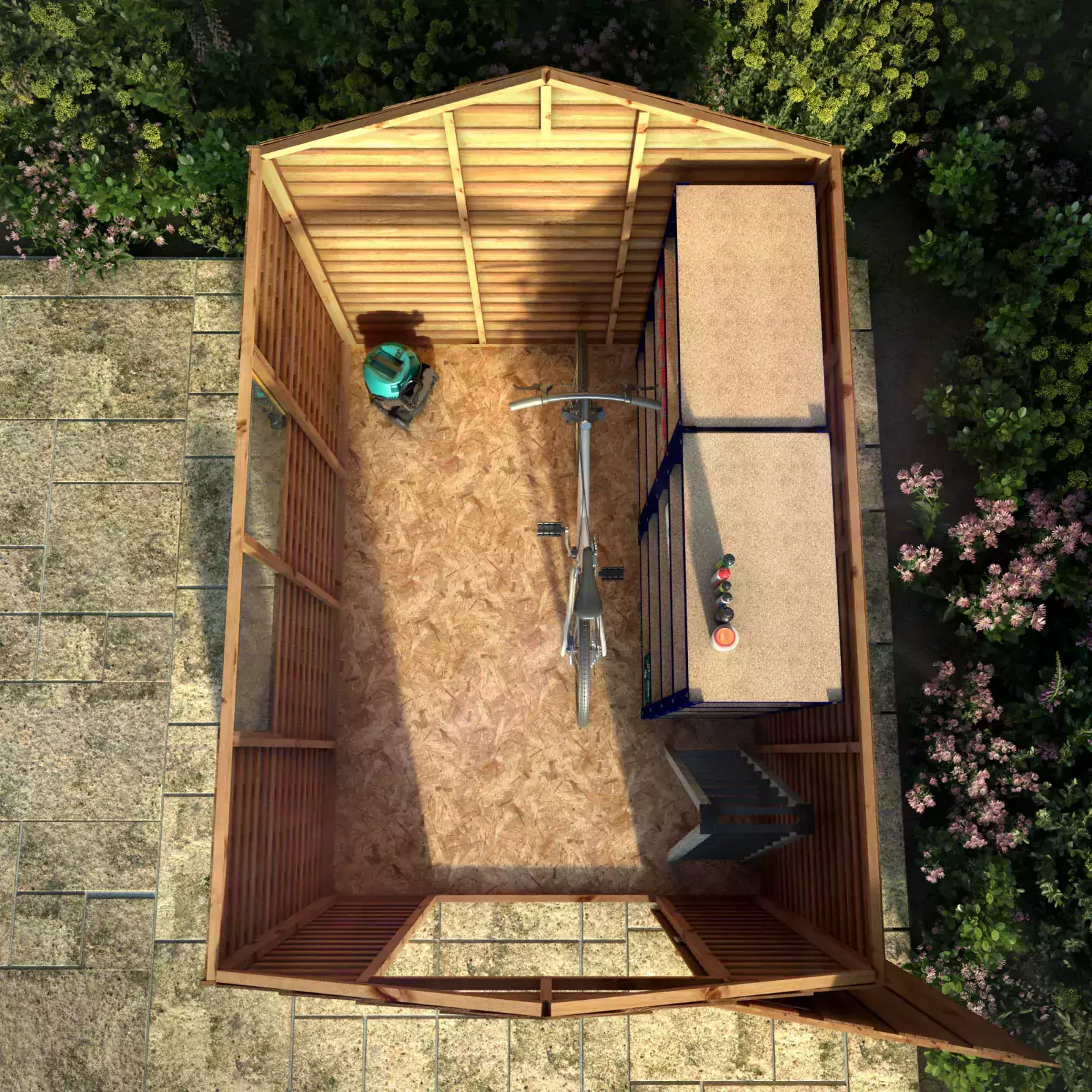 A Solid sheet board is used to make the floor and roof, a durable material made up of several layers of tightly compacted oriented strands. Solid sheet board is perfect for everyday general use and storage. The building is completed with thick wooden framing to support the overlap panelling internally, creating a rigid, long-lasting structure and a classic apex roofline, offering a large amount of headroom inside, ideal for storing taller items such as strimmers and ladders.
