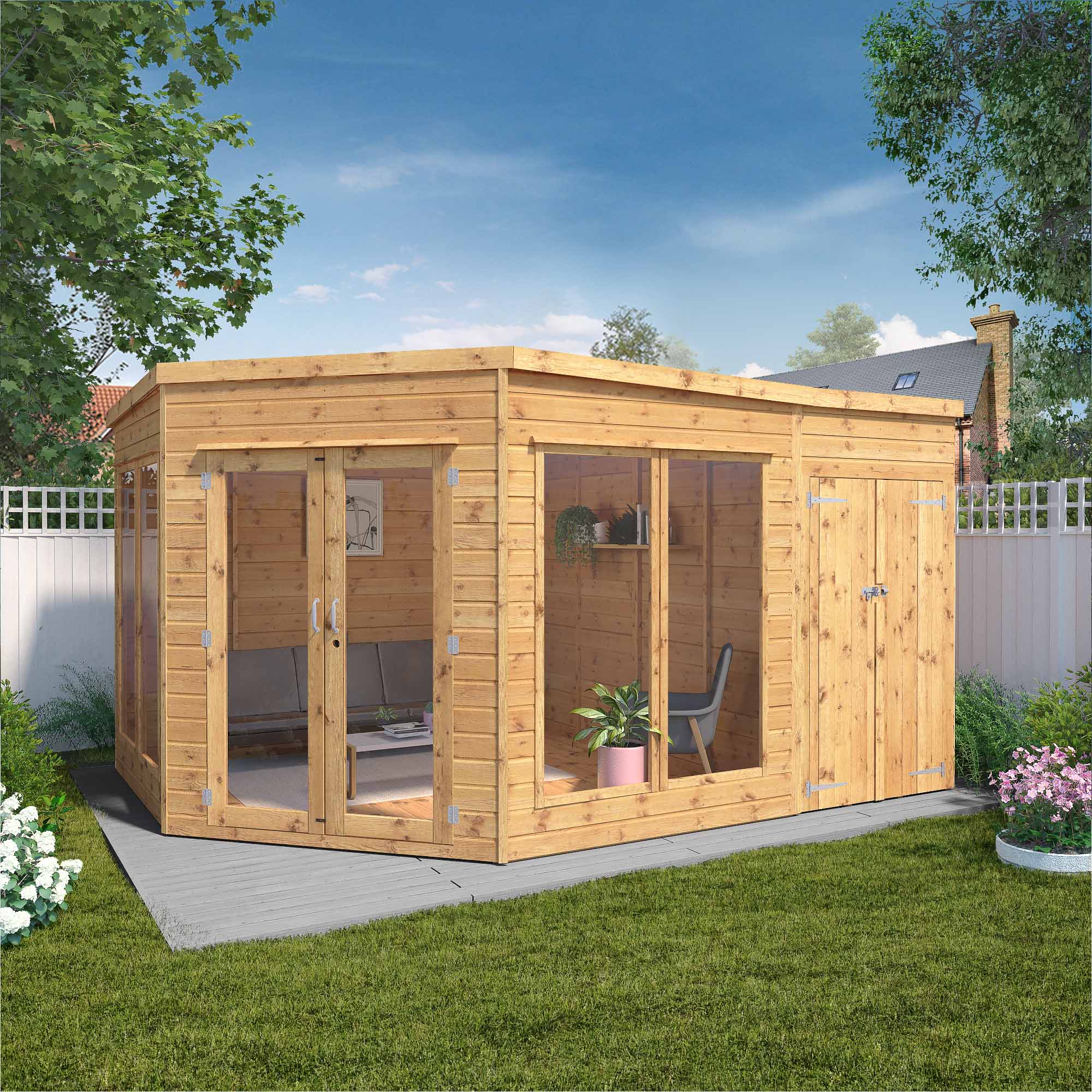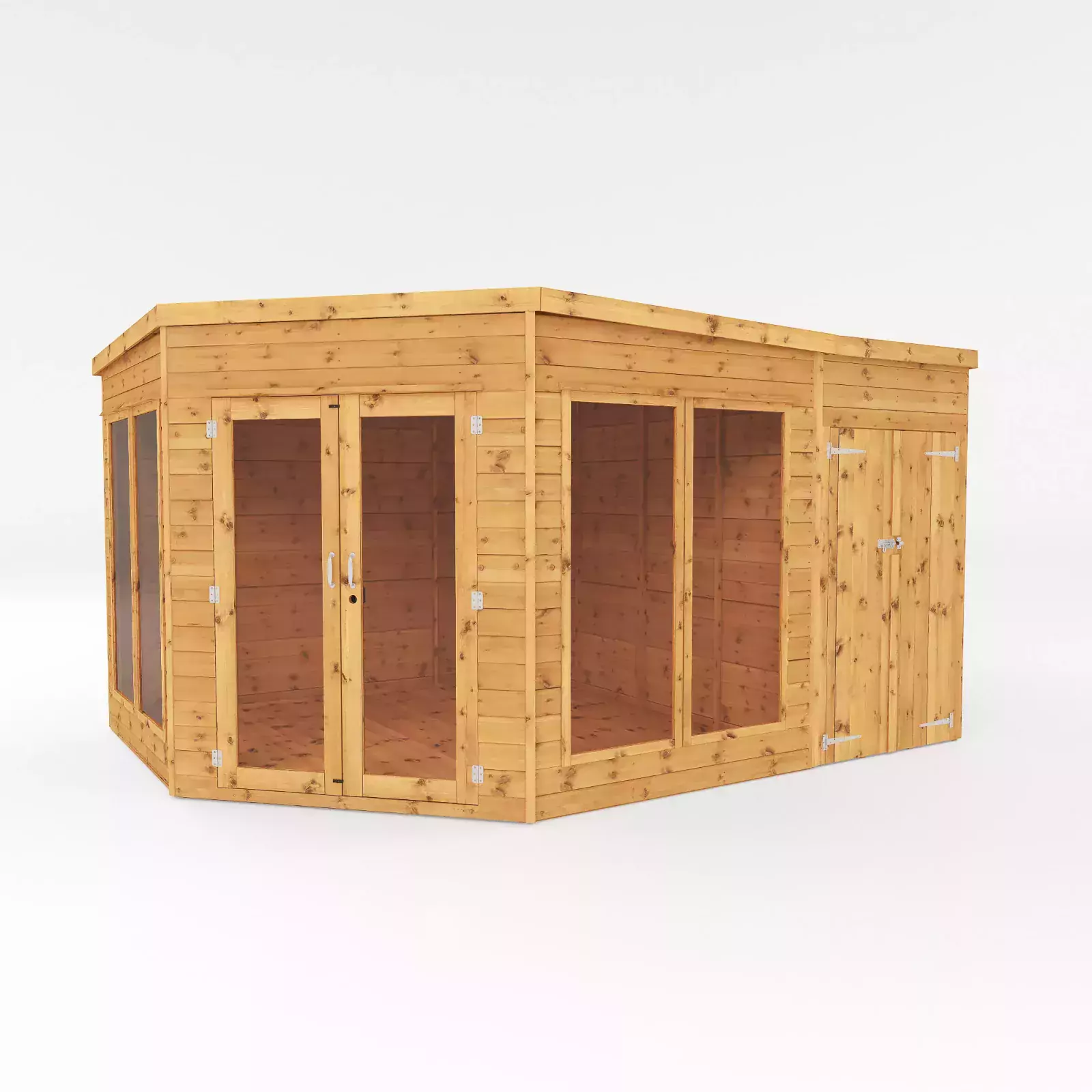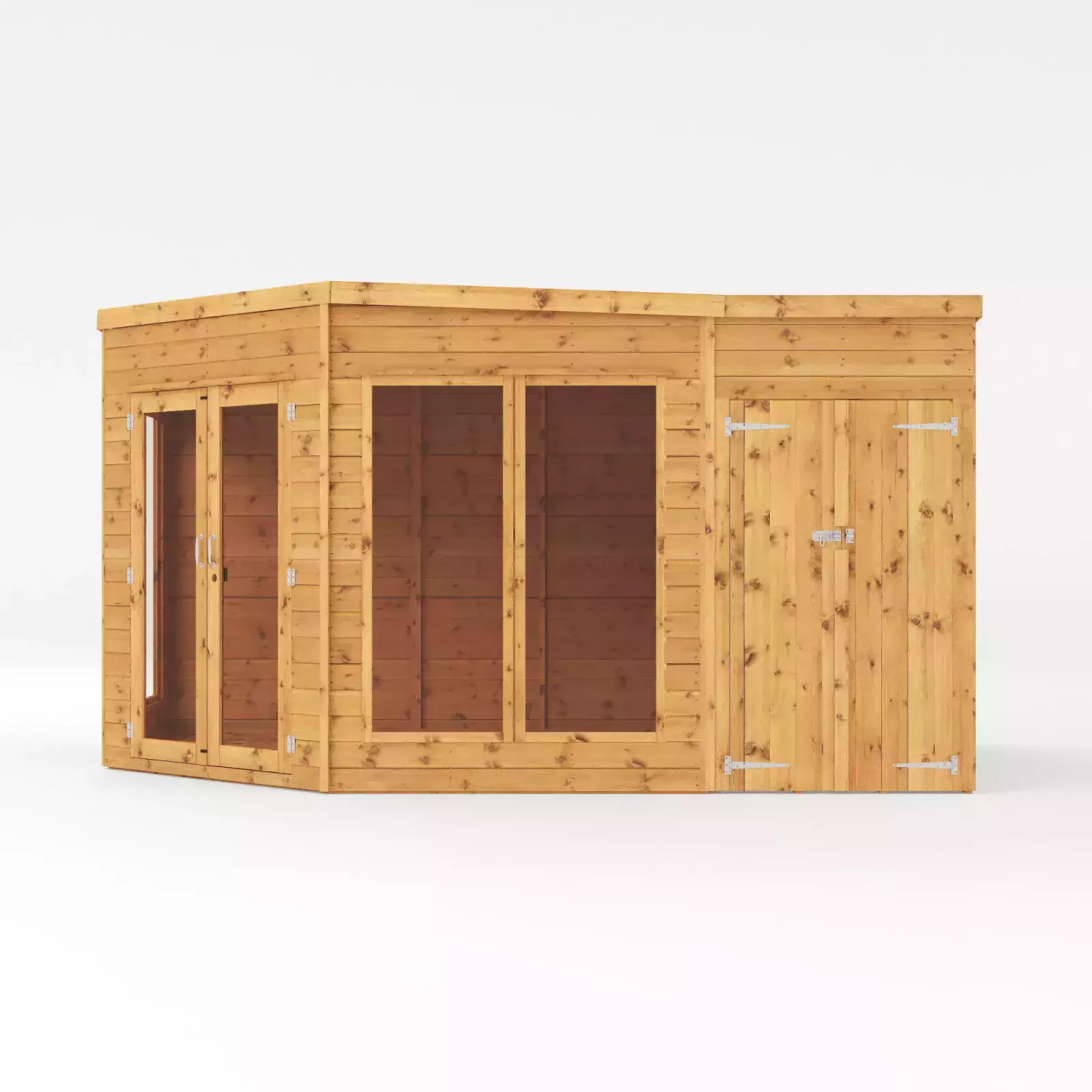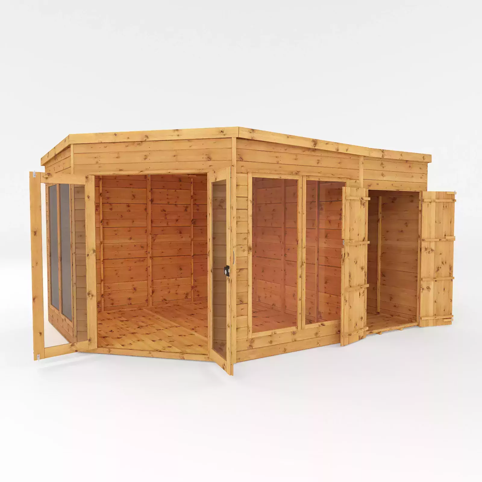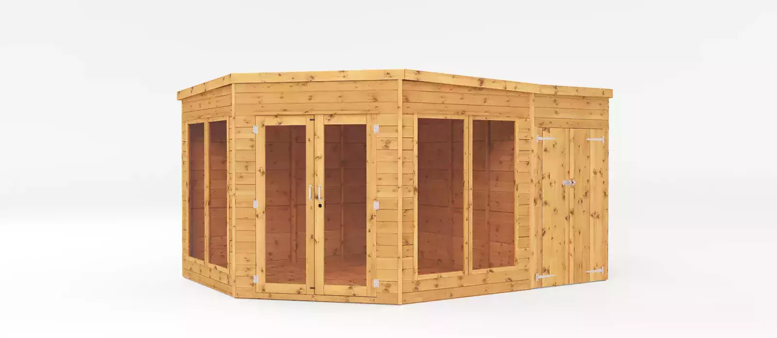 The Mercia 9’x 13′ Premium Corner Summerhouse and Side Shed provides a large open space to relax in on a bright summer’s day.