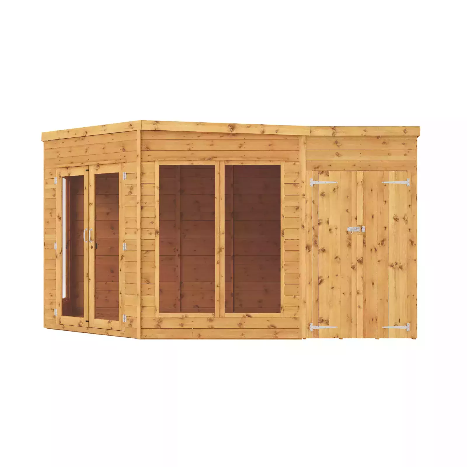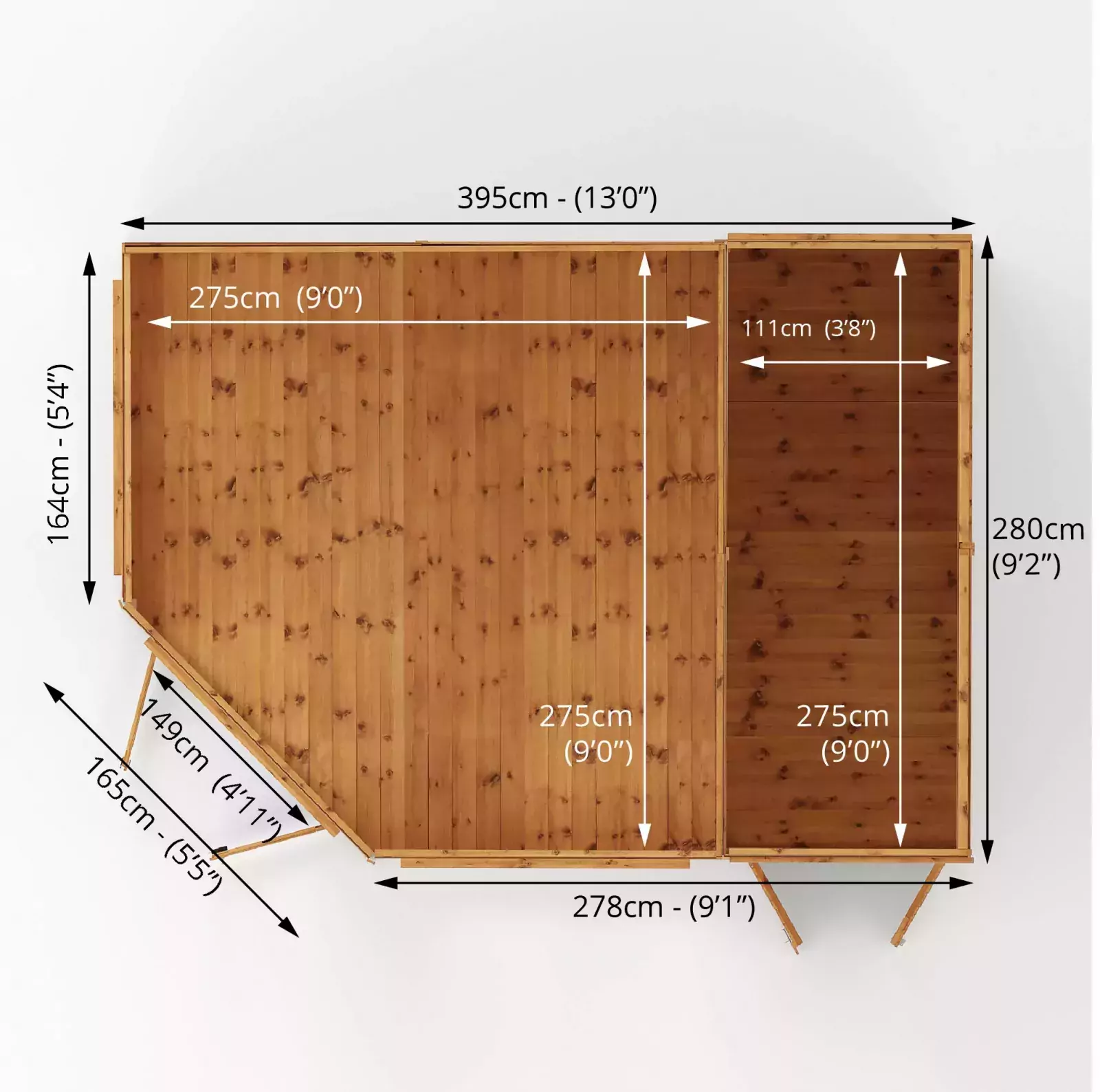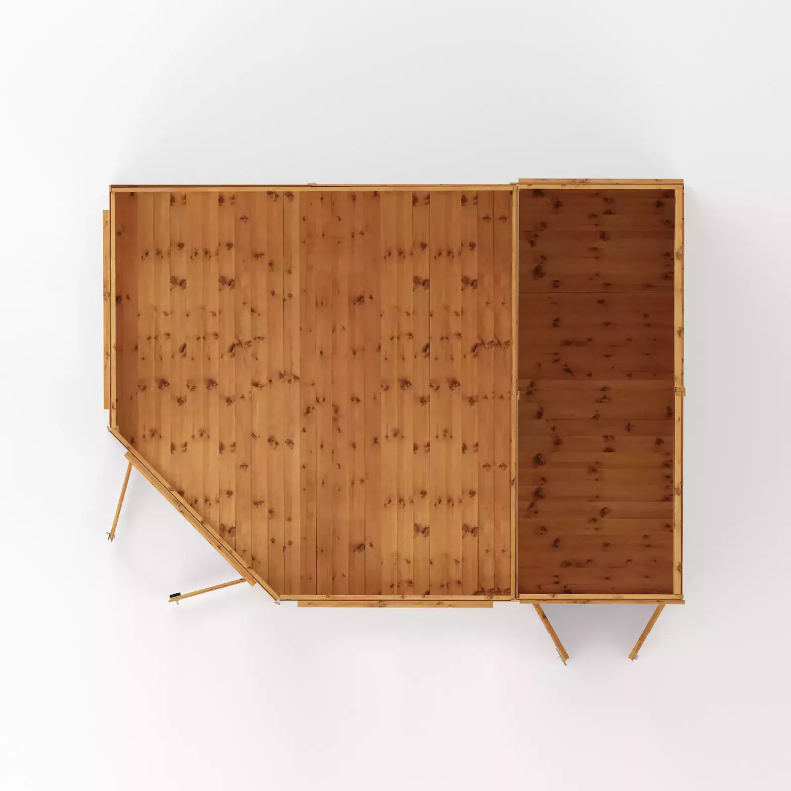 The Mercia 9’x 13′ Premium Corner Summerhouse and Side Shed is the perfect retreat to relax and unwind in your garden, all year round. Its unique pentagonal design fits neatly into the corner of your garden, helping you make the most of your space. It boasts a sturdy build with 12mm tongue and groove cladding to the roof and floor, dip treated timber, plus sand felt roofing for durability and resistance to the elements.