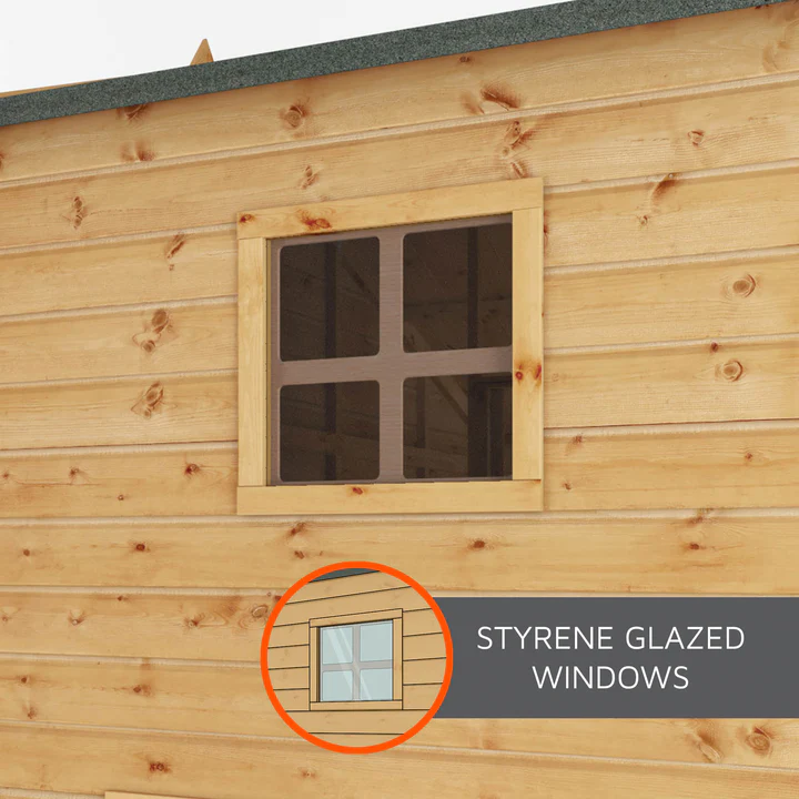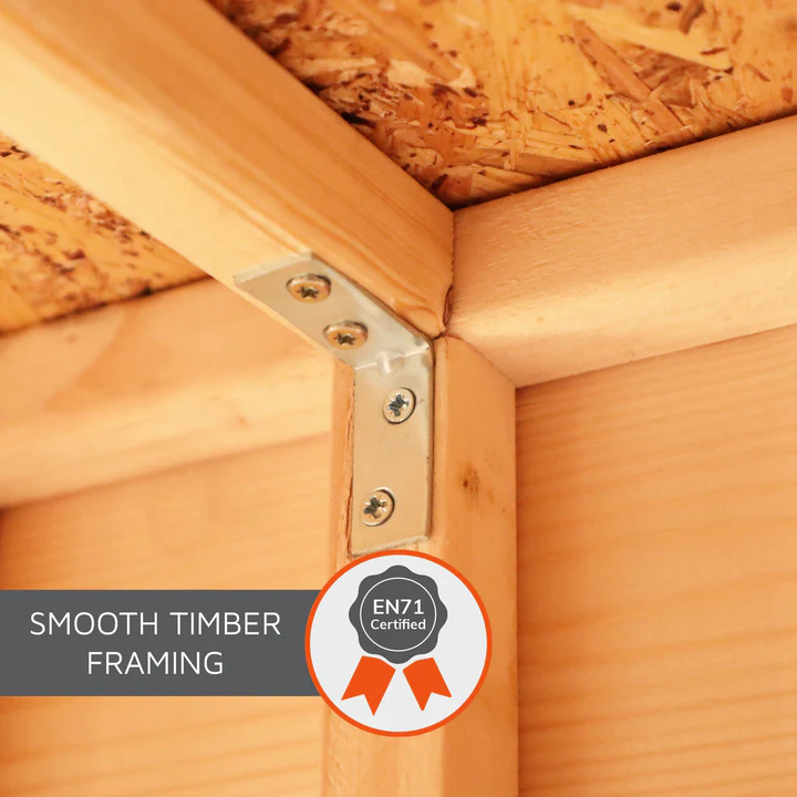 This walls of this playhouse have been constructed using high quality interlocking shiplap tongue and groove cladding for a robust and durable build. This interlocking design prevents water ingress and creates a rigid structure. The roof and floor are made from quality solid sheet board material, constructed of several layers of compacted orientated strands.