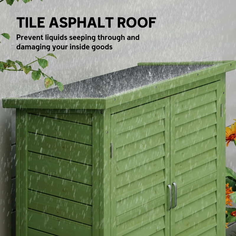 Keep all your garden essentials efficiently organised and beautifully stored away with this Outsunny 1.5′ x 2.8′ Fir Timber Slatted Door Garden Storage Cabinet- Green.