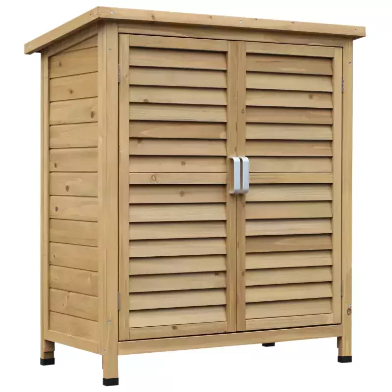 Crafted from solid fir wood with a top coat, this garden storage utility is resistant to stains, water, corrosion and mildew to ensure long term use against everyday wear and tear. Inside os the vertical storage shed are two spacious and sturdy shelves with shutter style doors that provide enough ventilation when closed. On the shed top sits a tilted roof with a felt top to stop any water build-up. This outdoor shed is the perfect storage compartment for your gardening tools, outerwear and shoes and more.