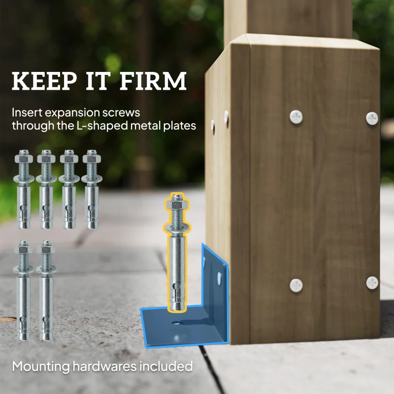 Expansion screws and metal plates included to mount your pergola to hard ground