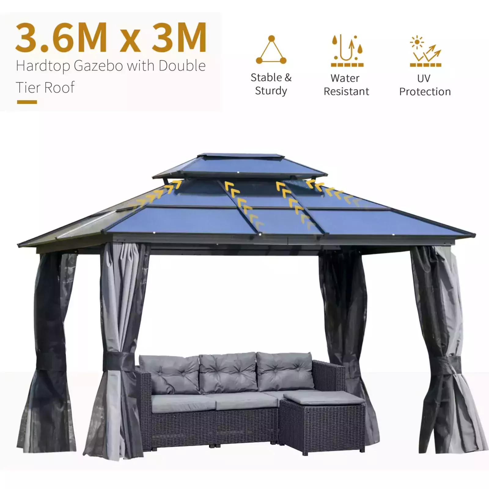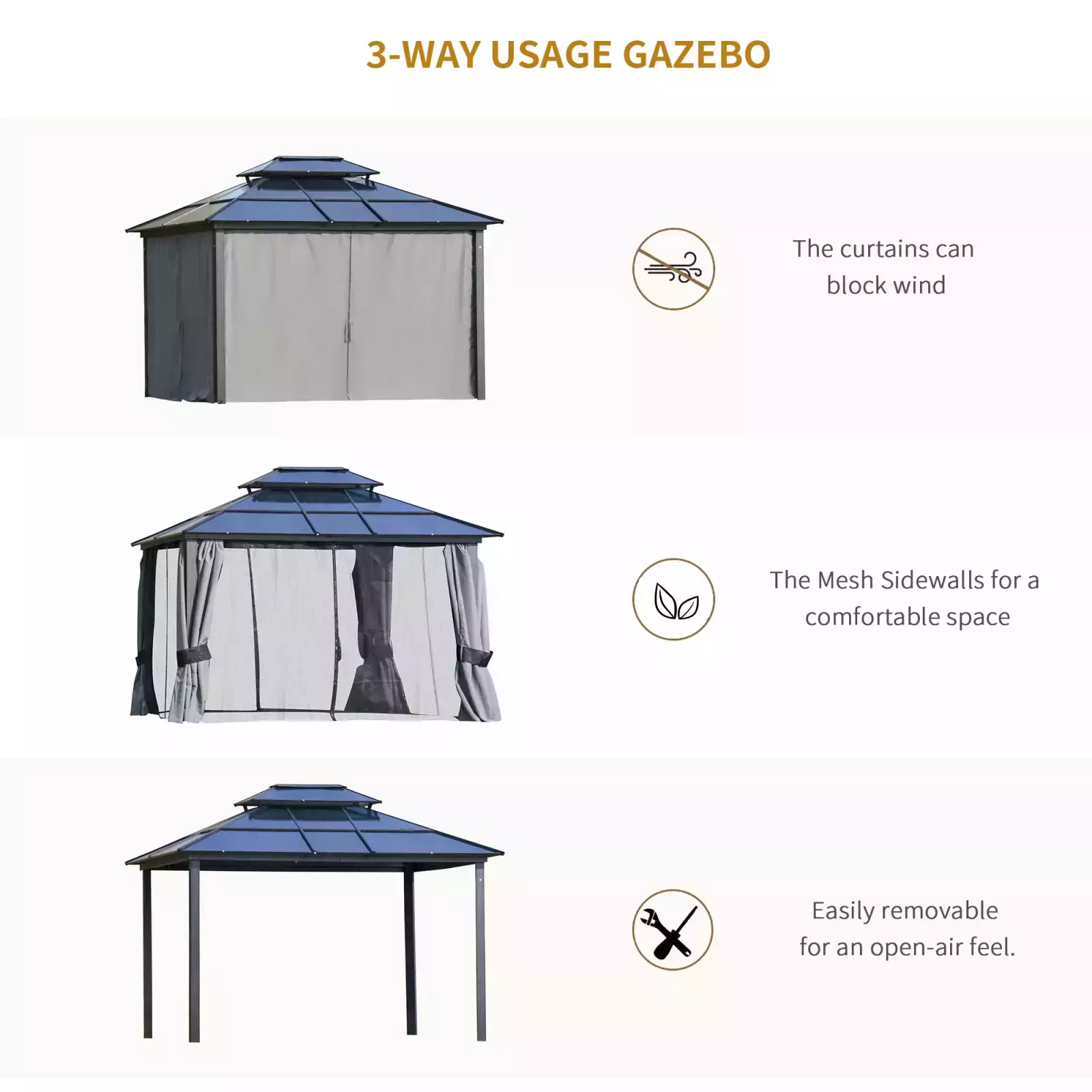 Polycarbonate hardtop is tough and protective against sun, wind and rain. Two-tier design controls air in and out better