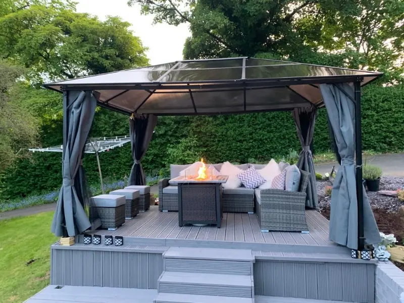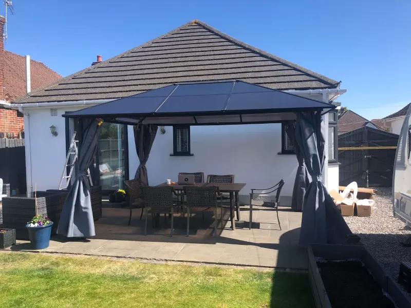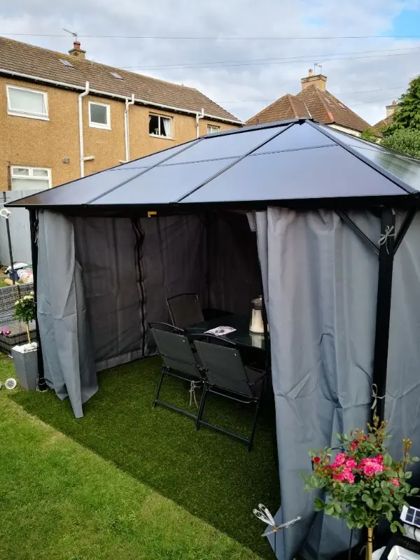 Offering privacy and protection when needed are the dark grey curtains, which are fitted to the corners of the gazebo to allow them to be tied back when not needed, with mesh netting to keep any bugs and pests out when let down. It’s finished with a hardtop roof, offering you better protection from the sun, rain and wind.