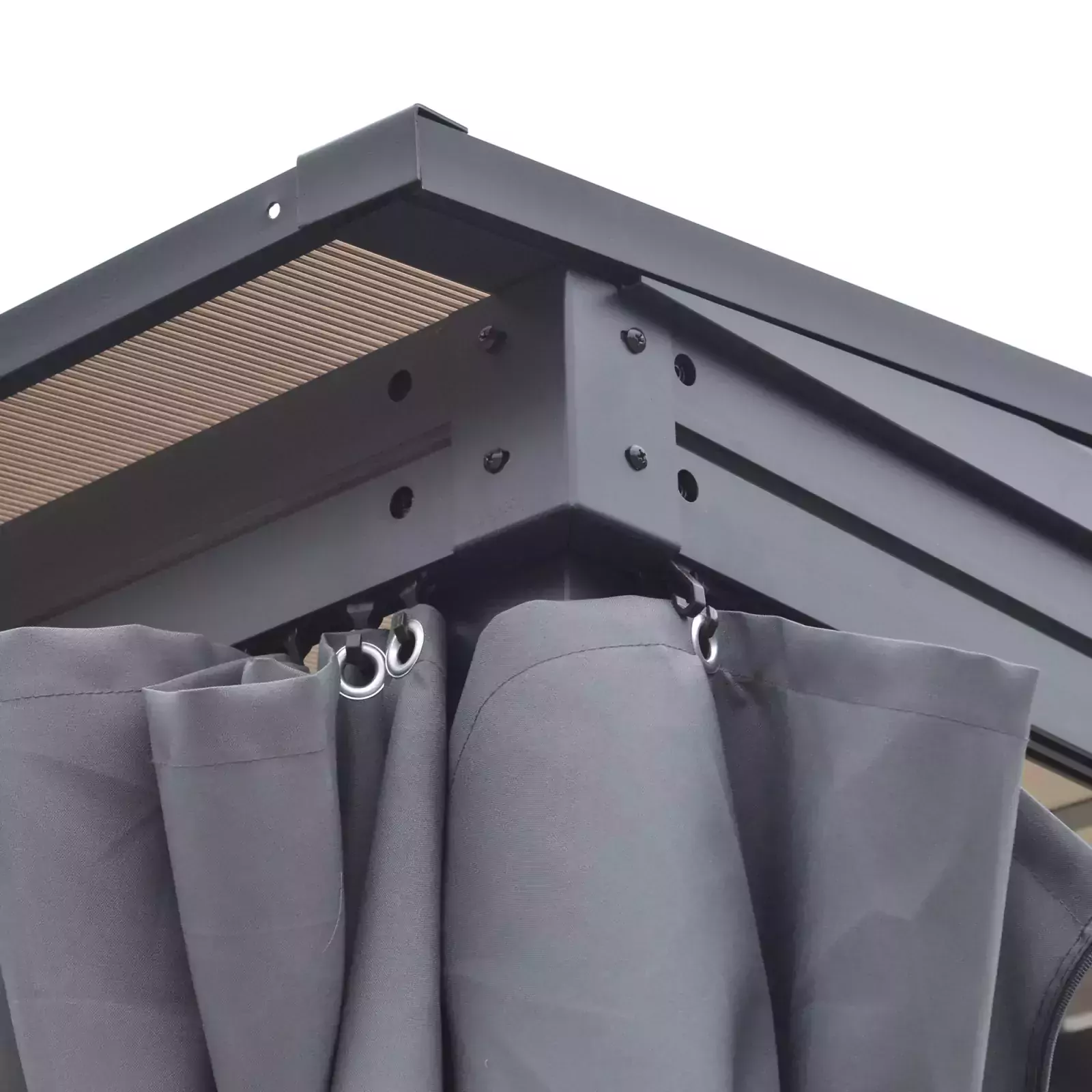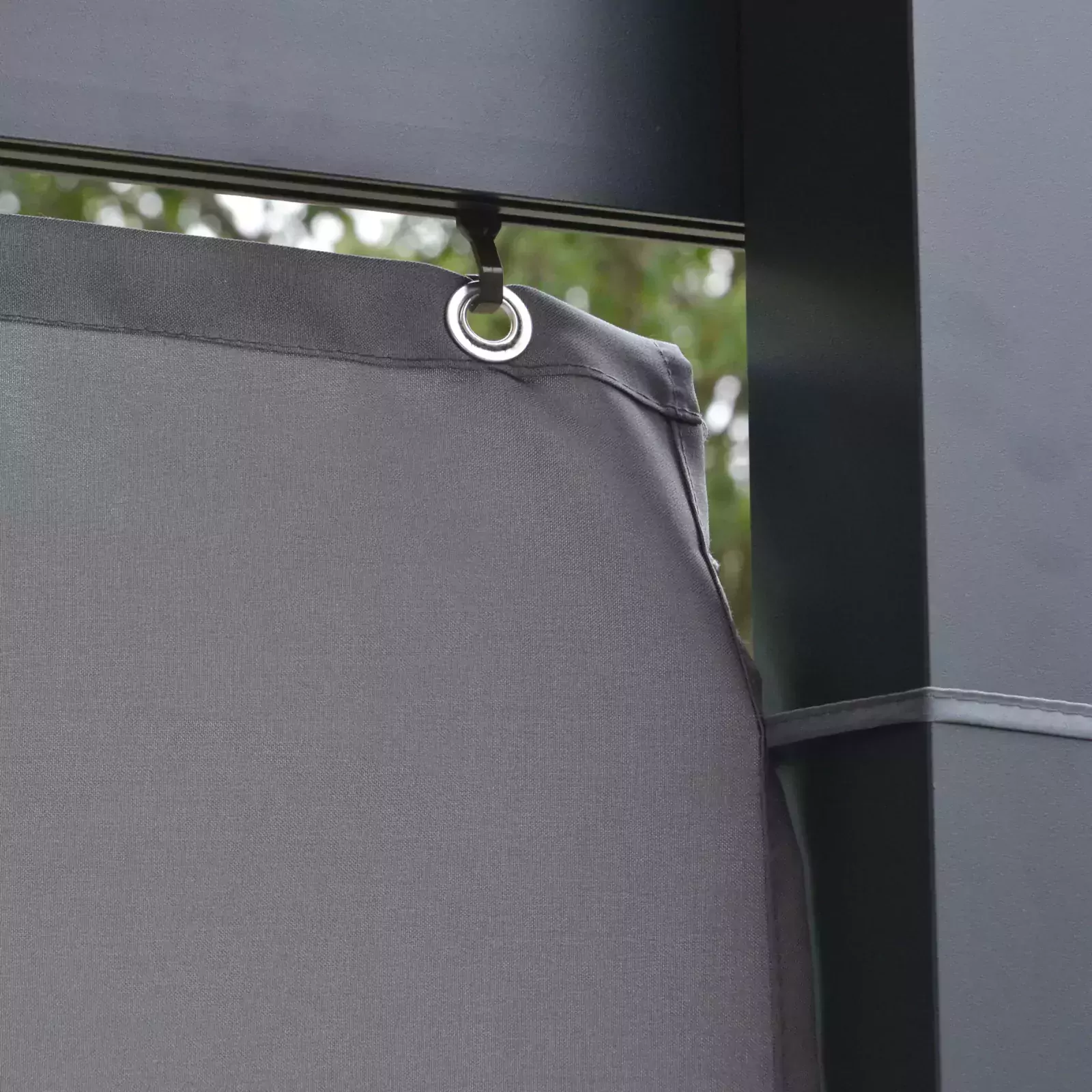 Add style and flair to any outdoor space with this Outsunny pergola. The large size provides plenty of room underneath for a full dining/seating set up – meaning there’s room for the whole family. The aluminium frame is tough so it stands in place, with a powder coating for extra strength and protection. It’s fitted with adjustable curtains on each corner, giving you control of leaving them open or closed to create specific vibe for your gatherings. Finished with a polycarbonate roof to prevent water leaking through, sloped so water falls off.