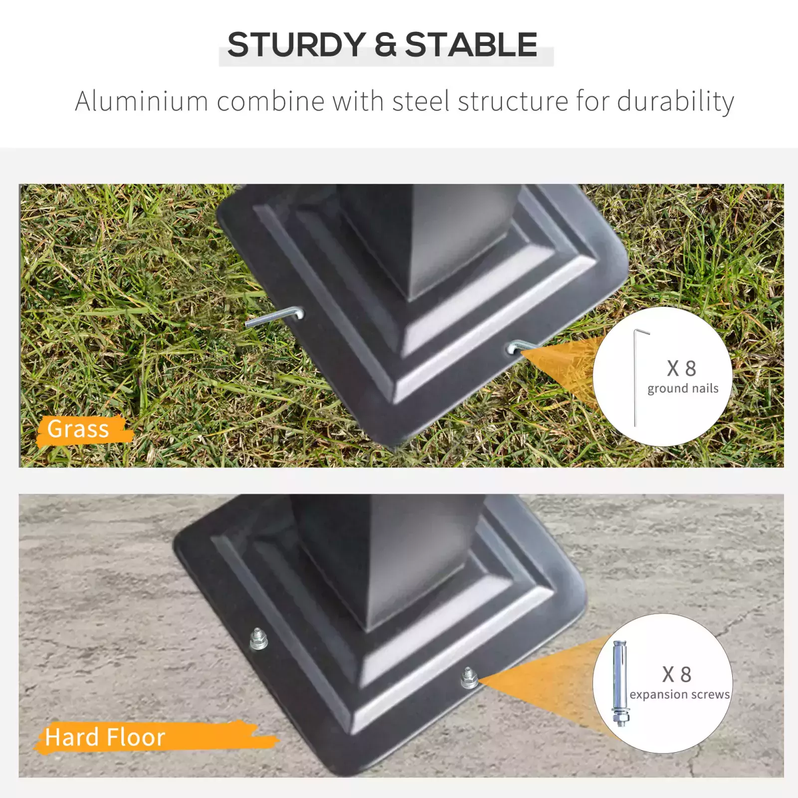 Equipped with 8 ground nails and 8 expansion screws for extra stability